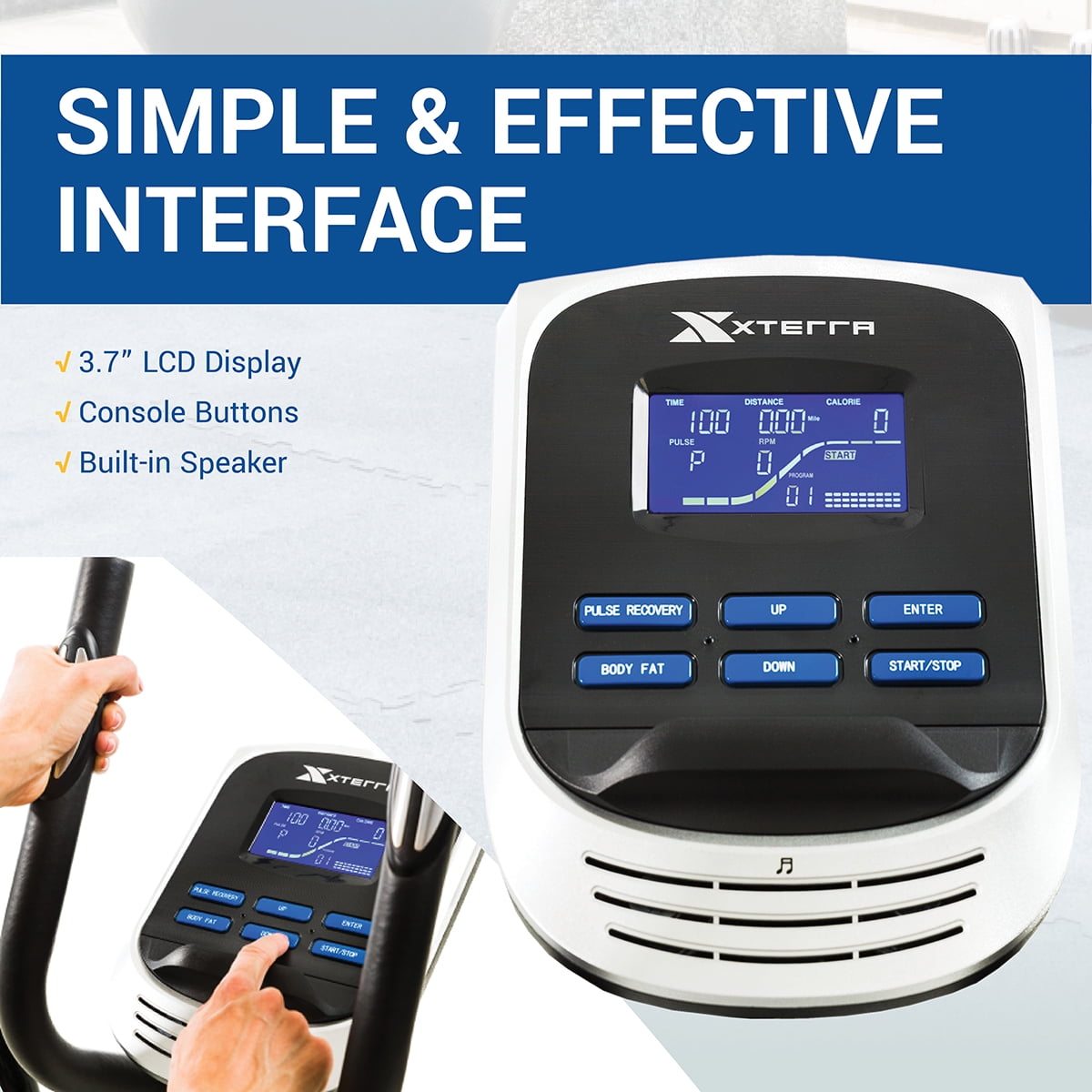 The XTERRA Fitness EU150 Hybrid Elliptical combines a full body elliptical workout with the seated comfort of an upright bike. It offers a smooth, low-impact, total-body workout in a compact design. Simply stand on the pedals to experience the elliptical trainer with a 13” stride length, 11 lb flywheel, belt drive system, and friction-free magnetic resistance. By sitting, you can change the intensity of your workout and target alternate muscle groups. This 2-in-1 combo workout combines two great pieces of equipment into one. The EU150 allows you to challenge yourself with an impressive 24 levels of resistance and 23 motivating programs. Easily keep track of your workout data with the large 3.7” bright blue backlit LCD – it clearly displays program profile, time, speed, distance, calories, RPM, pulse, and resistance level. To make your training experience more enjoyable, the console also features an audio jack and speaker so that you can listen to your favorite music. Make your workouts more effective by easily monitoring your heart rate with the handlebar mounted hand pulse sensors. For improved comfort the EU150 provides a large contoured and padded seat that adjusts up and down, as well as forward and back. It also comes with multi-grip, soft, padded handlebars along with oversized pedals. Start enjoying the convenience of total body conditioning in your home today with the XTERRA Fitness EU150 Hybrid Elliptical.