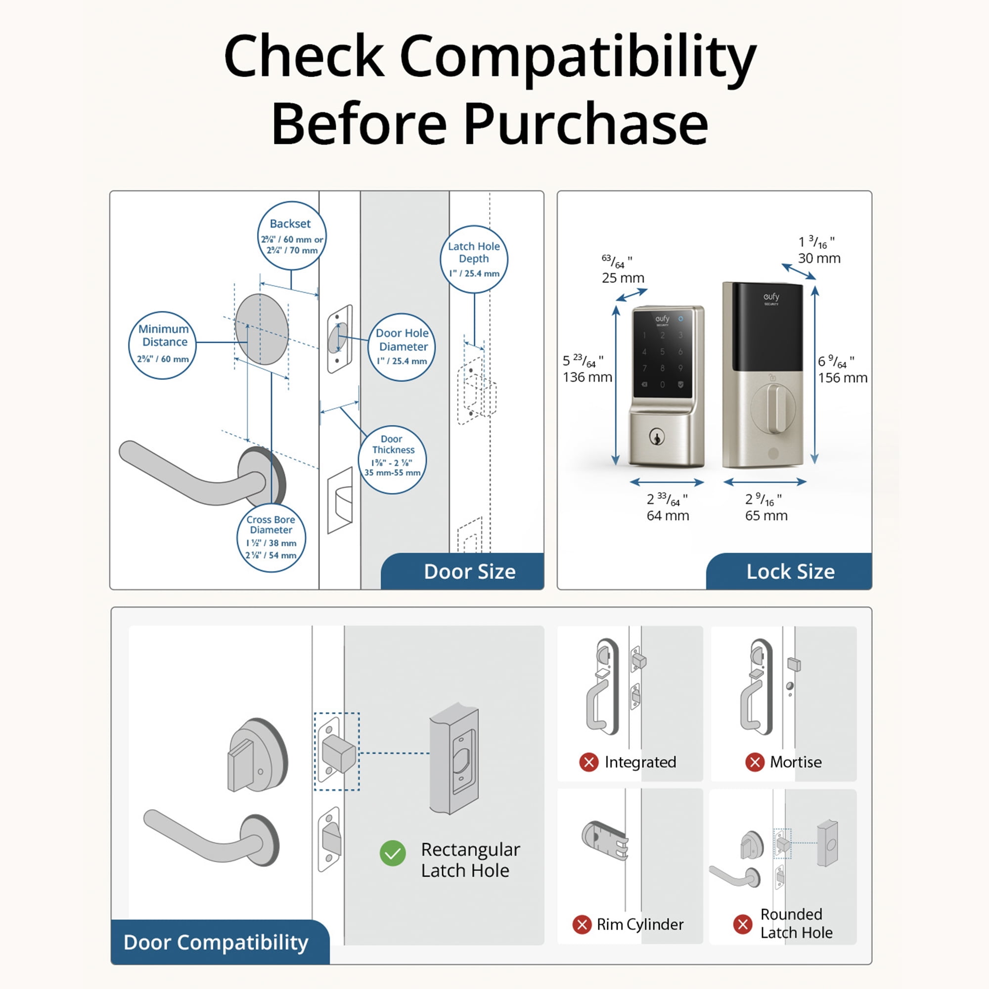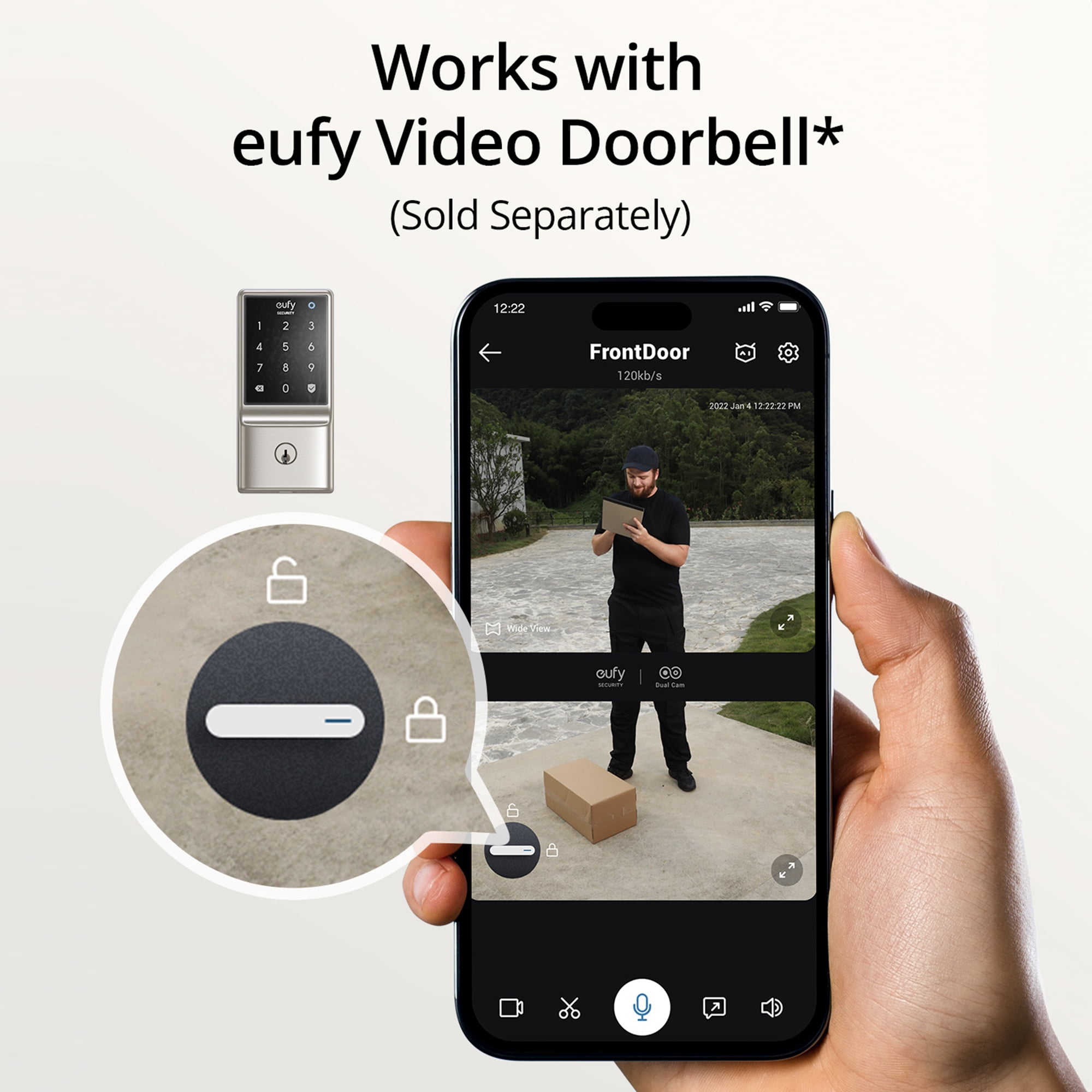 Control from Anywhere with Built-in Wi-Fi: No bridge required! Control your Smart Lock C210 from anywhere with remote access via the eufy Security mobile app including, easy setup to real-time notifications, event history, and more 5 Ways to Unlock: Open your front door lock using the eufy Security App, keypad, physical key, Apple Watch, or vocal commands with Amazon Alexa and Google Assistant Integrated Smart Home: If you have a eufy Doorbell add your Smart Lock C210 to your routines and control devices together for keyless entry. Send an alarm triggered by an usual attempt to open your door lock Easy Installation: Compatible with most US existing deadbolts for 15-minute easy install without drilling. 18-month after sales service with 24/7 customer support Reliable and Durable: Builders Hardware Manufacturers Association (BHMA®) Certified after being locked and unlocked more than 100,000 times *Tested by BHMA, the Smart Lock C210 can be expected to lock and unlock up to 10 times a day for over 30 years. *For emergency power supply only, cannot be used to charge the battery Addtl Specs: Face Plate Depth (in.) – .13 Face Plate Width (in.) – .98 Face Plate Height (in.) – 2.2 Strike Plate Width (in.) – 1.1 Strike Plate Height (in.) – 2.73 Projection (in.) – 1.05 Required Door Thickness (in.) – 1-3/8 in to 2 1/8 in Backset Size (in.) – 2-3/8 in or 2-3/4 in, Adjustable Keyway – SC1 Total Number of Keys Included – 2 Battery Type – 4 x AA Battery required and included Security/ANSI Grade – ANSI Grade 3 IP Rating (Outdoor assembly) – IPX3
