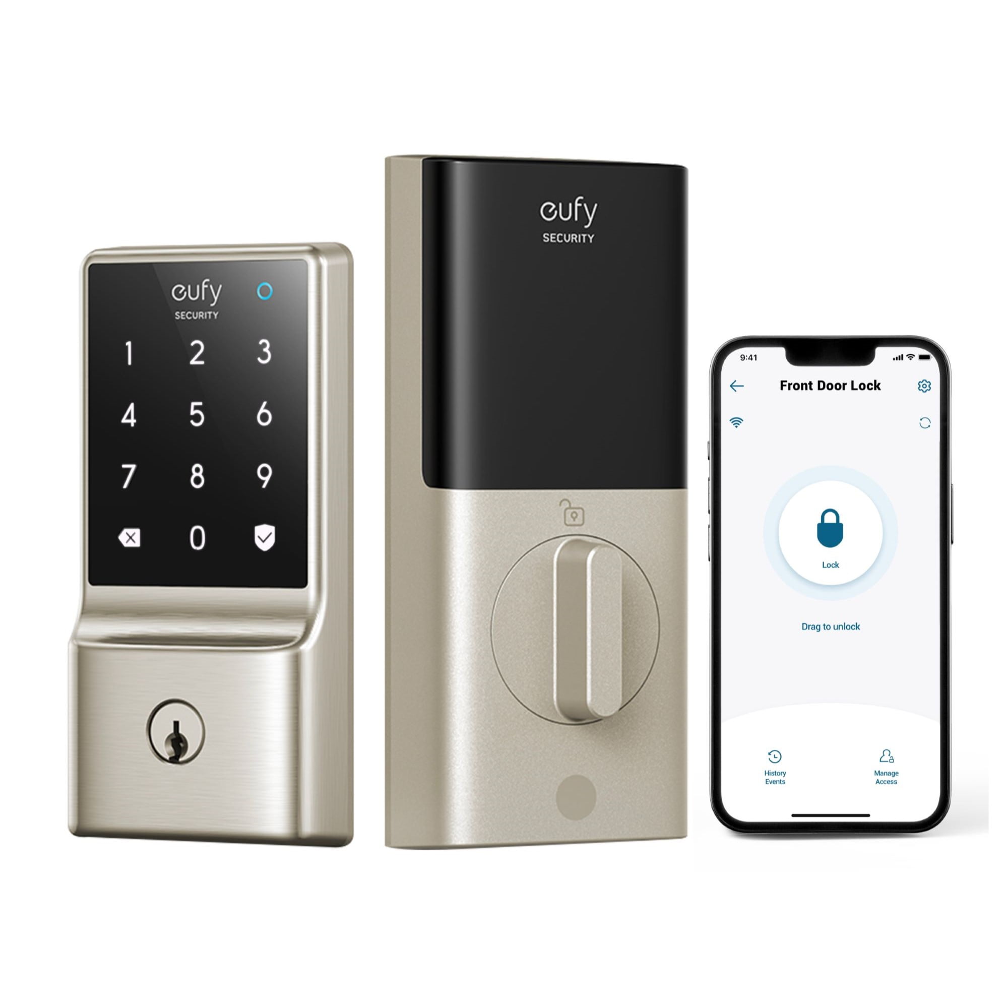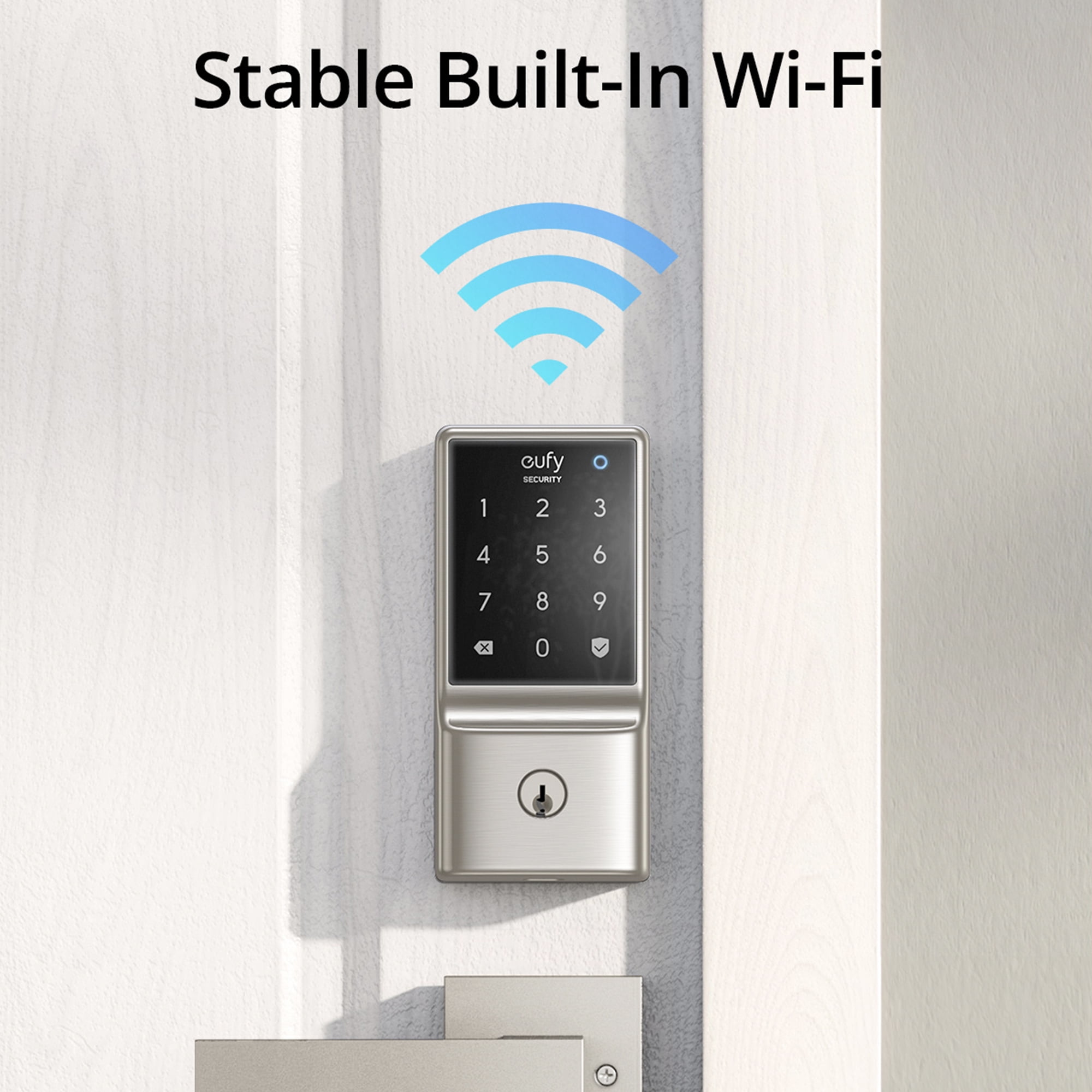 Enhance your home security from wherever you are with eufy 5-in-1 Smart Lock C210. No separate bridge required, this smart lock is Wi-Fi enabled and compatible with eufy Security App for remote control anytime, anywhere. Receive notifications, set and disable time-based passcodes, and view door activity history for added peace of mind. In The Smart Lock C210 offers 5 unlocking methods: hands-free via the eufy App, voice control with Alexa or Google Voice Assistant, a smudge-free touchscreen keypad, Apple Watch, or the included physical keys. Its sleek design suits all door styles and features an automatic lock to prevent unauthorized access. Withstanding outdoor temperatures of -22℉ to 158℉, it offers around 4 months of battery life and can be instantly unlocked with a portable charger if power runs out.