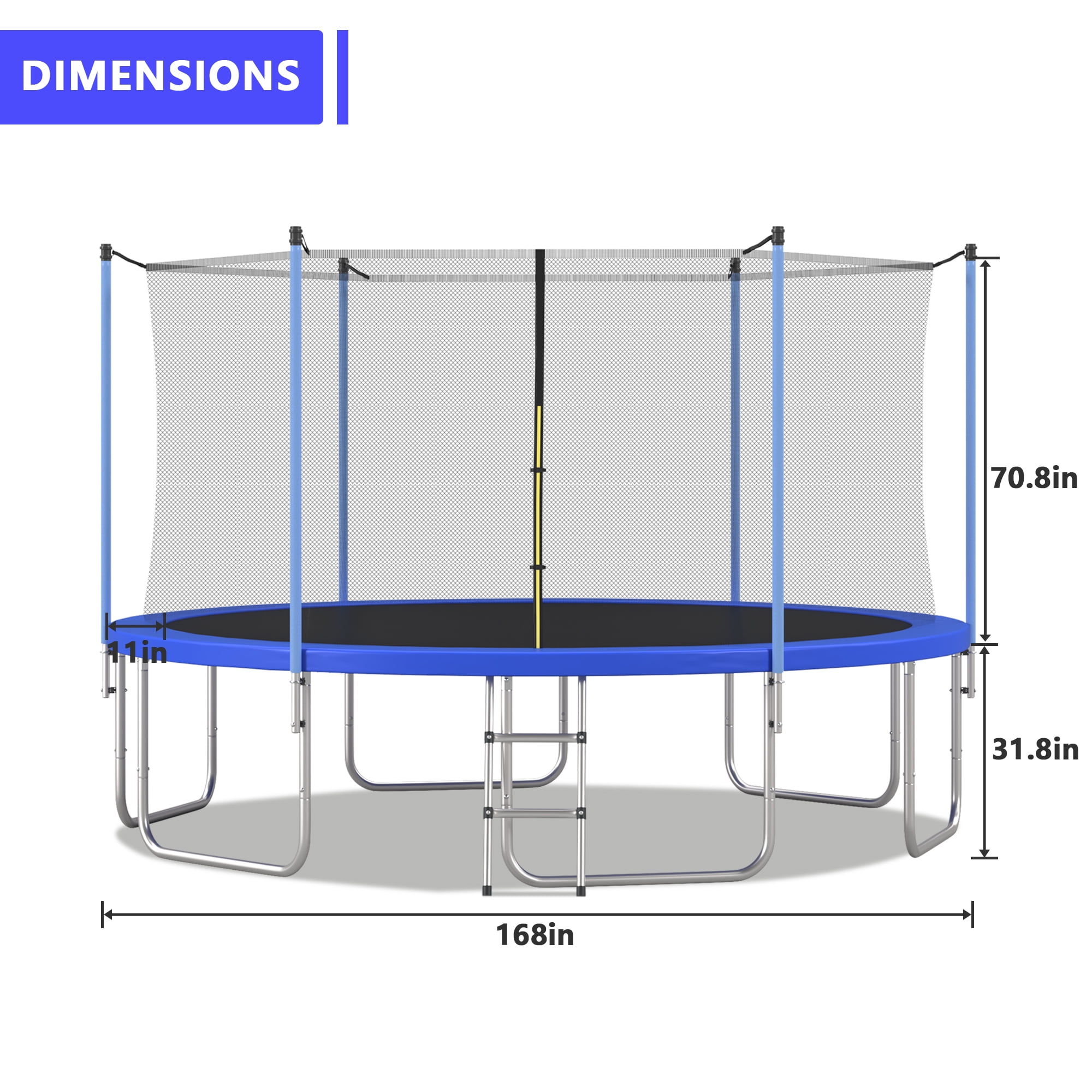 Trampoline Diameter:168” Net Pole Height:70.8” Mat / Frame Height:31.8″ Inner/Outer Enclosure: Inner enclosure UV Resistant:UV Resistant Pad Number of Support Legs:6 Spring Count:72 Safety Pad Material:PVC Jump Surface Material:Polypropylene Rust/Weather Resistant:Yes