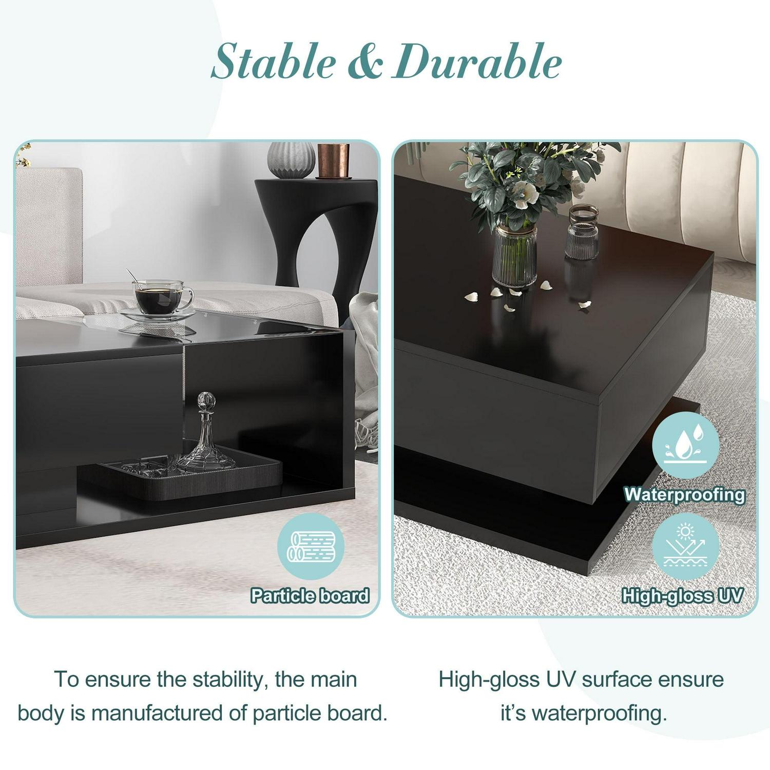 Stable & Durable To ensure the stability, the main body is manufactured of particle board. High-gloss UV surface ensure it s waterproofing.
