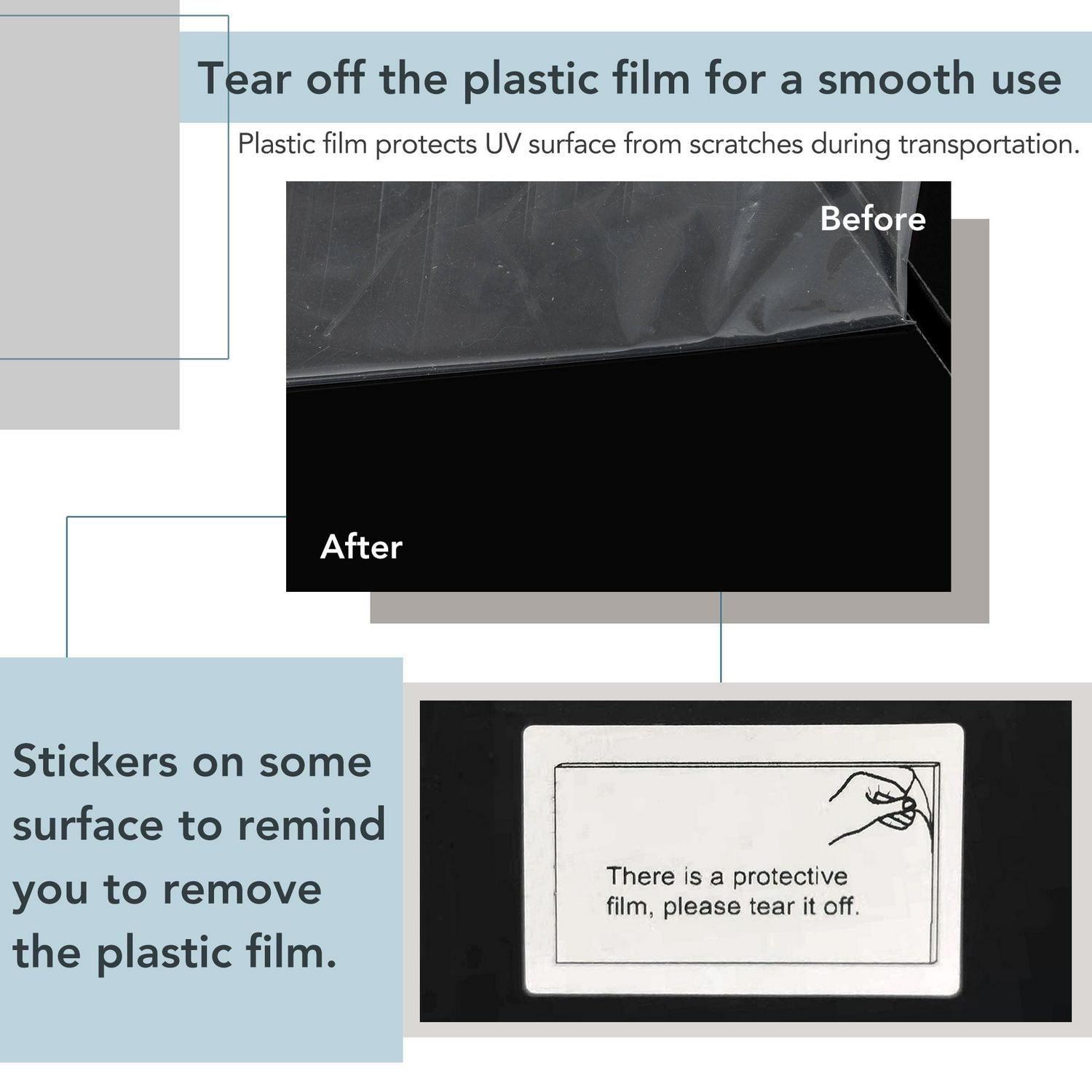 Notice The plastic film for protecting UV from scratches should be teared off before put into use. If there is light dust on the edge, it can be wiped with a wet rag.