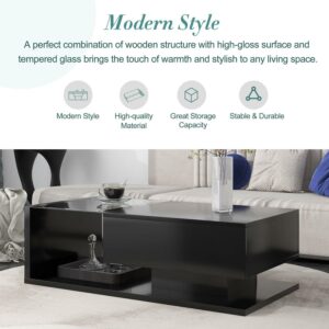 EUROCO 39.3 Coffee Table with Tempered Glass, Wooden Cocktail Table with High-gloss UV Surface, Modernist 2-Tier Rectangle Center Table for Living Room, Black