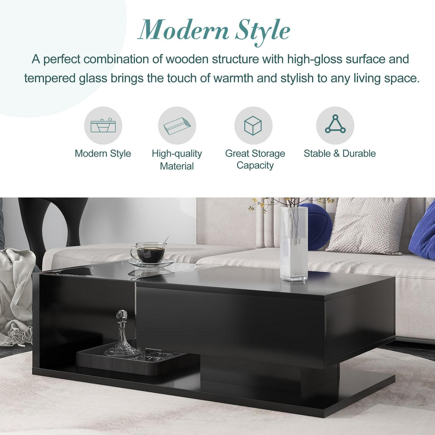 Modern Style A perfect combination of wooden structure with high-gloss surface and tempered glass brings the touch of warmth and stylish to any living space.