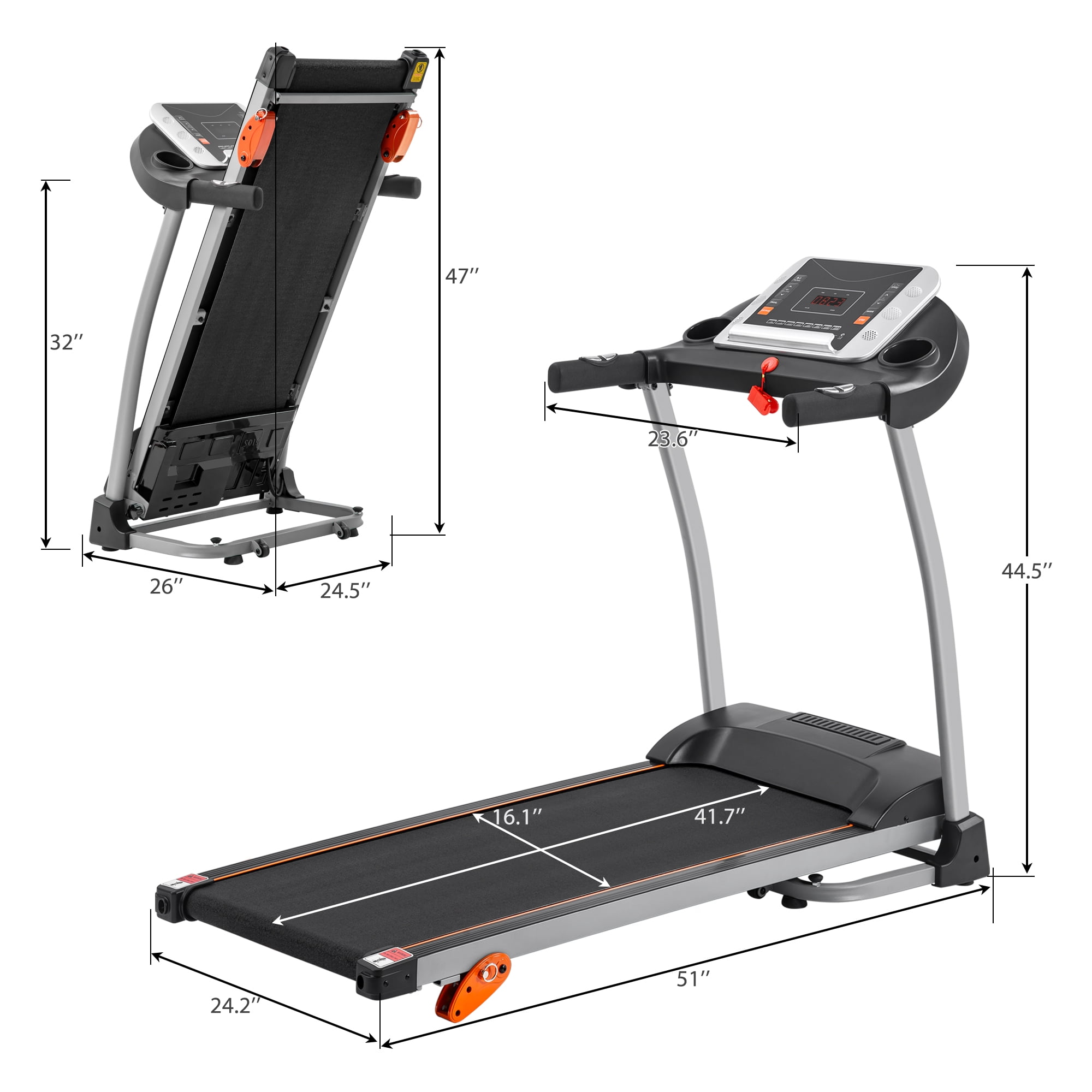 Euroco are committed to upgrading and updating treadmill products, using high-quality materials that are durable and more reliable, and will makes exercise easy and fun! This compact treadmill brings outdoor activities into your house, it’s a great choice for exercising indoors and providing a reasonable way to reach or maintain your workout goals. This treadmill has a compact design and a small footprint. Its easy-to-store folding mechanism design is very suitable for small apartments or home gyms, allowing users to choose to fold it up quickly, so as not to save valuable space in your home when needed. If you are looking for a compact treadmill,please do not hesitate to buy it. 【Stable and Durable】 This stable and durable treadmill provides everything you need for your daily exercise. Holds 240 pounds. The sturdy structure is equipped with a 2.5HP motor to ensure satisfactory training performance. 【 Adjustable Pedal 】 We have preset 12 built-in running programs for this treadmill, or you can choose the rhythm you want within the range of 0.5-7.5MPH as you like. The running board is 3-level manually adjustable to meet your personal experience. You can shut down this running machine immediately with the safety key on the control panel to avoid accidental injury. 【 LED Display 】 The standard LED display provides intuitive feedback of time, distance, speed, calories, and heart rate, so you can monitor your exercise status. Both armrests have integrated hand pulse sensors to provide synchronous monitoring of critical heart rate data. 【 Quiet 】 The excellent shock absorption effect of this treadmill comes from a multi-layer synthetic running belt and a reasonably structured running board, which keeps you away from common running sports damage and protects your knees, hips, ankles, and feet. The quiet belt drive system reduces noise interference while providing performance. 【 Easy to Store 】 Two bottle cages on the panel make water replenishment within easy reach and are equipped with a device stand for your smart device and built-in speakers to help relax while running. Easy to store and set up. Assembly size: 51″ x 24.5″ x 44.5″. Folded size: 26″ x 24.5″ x 47″.