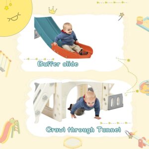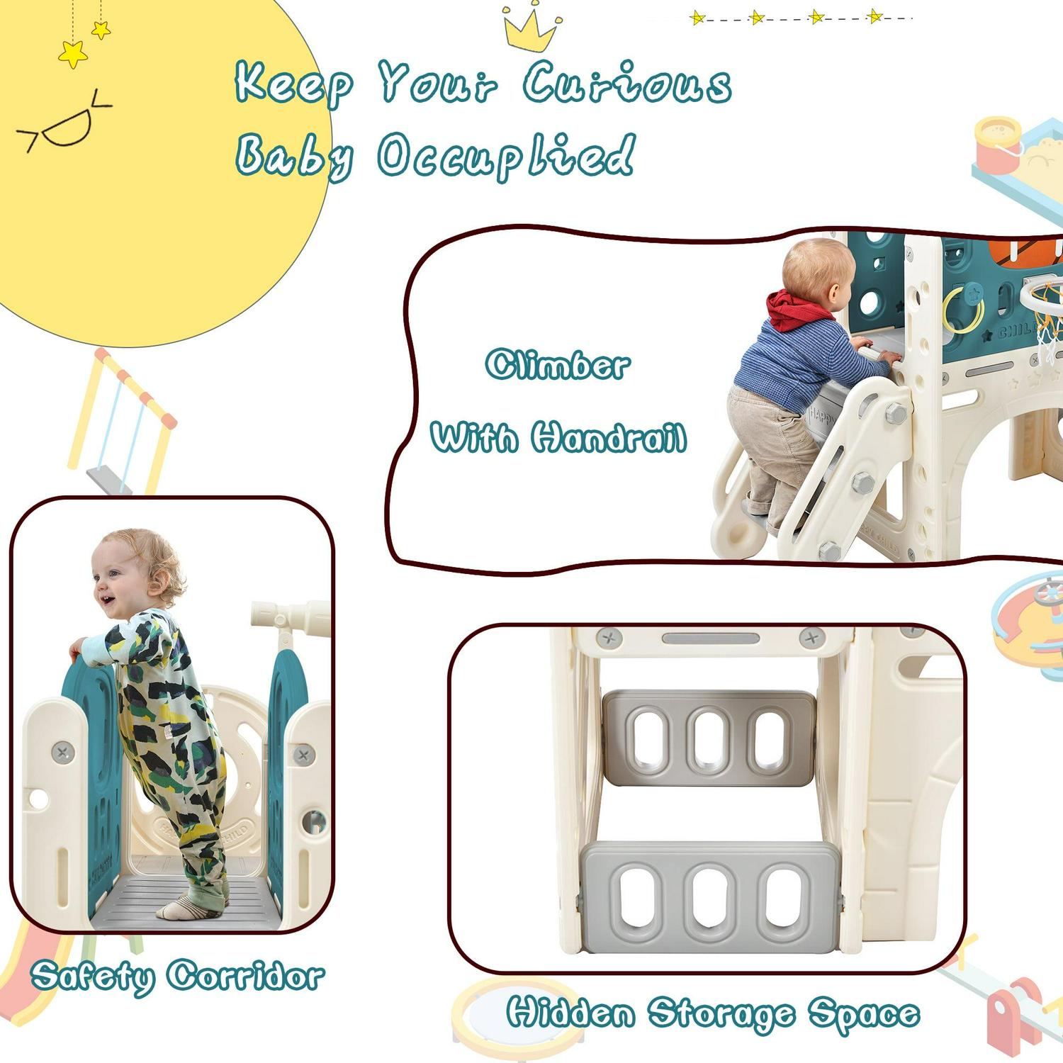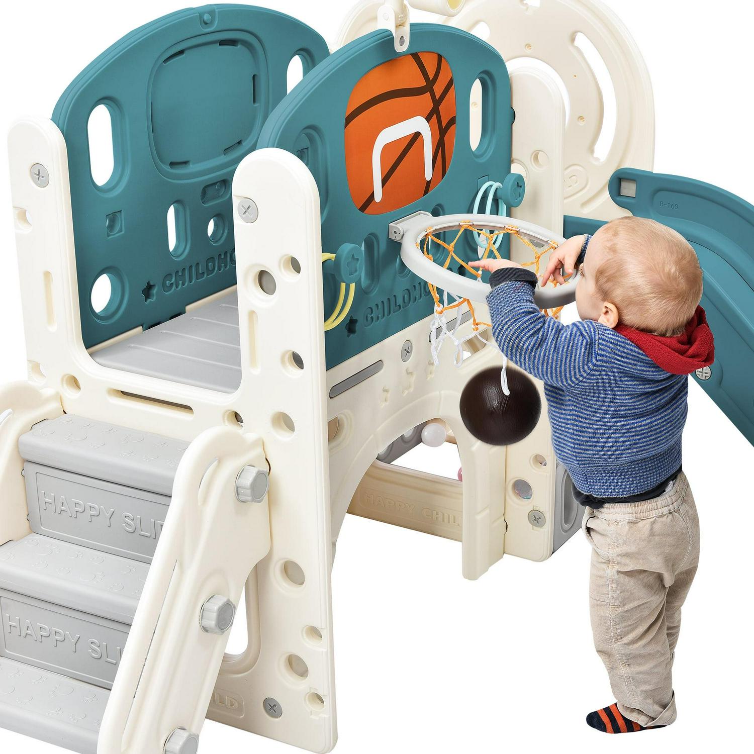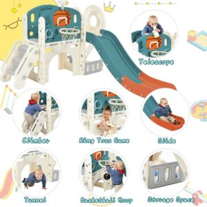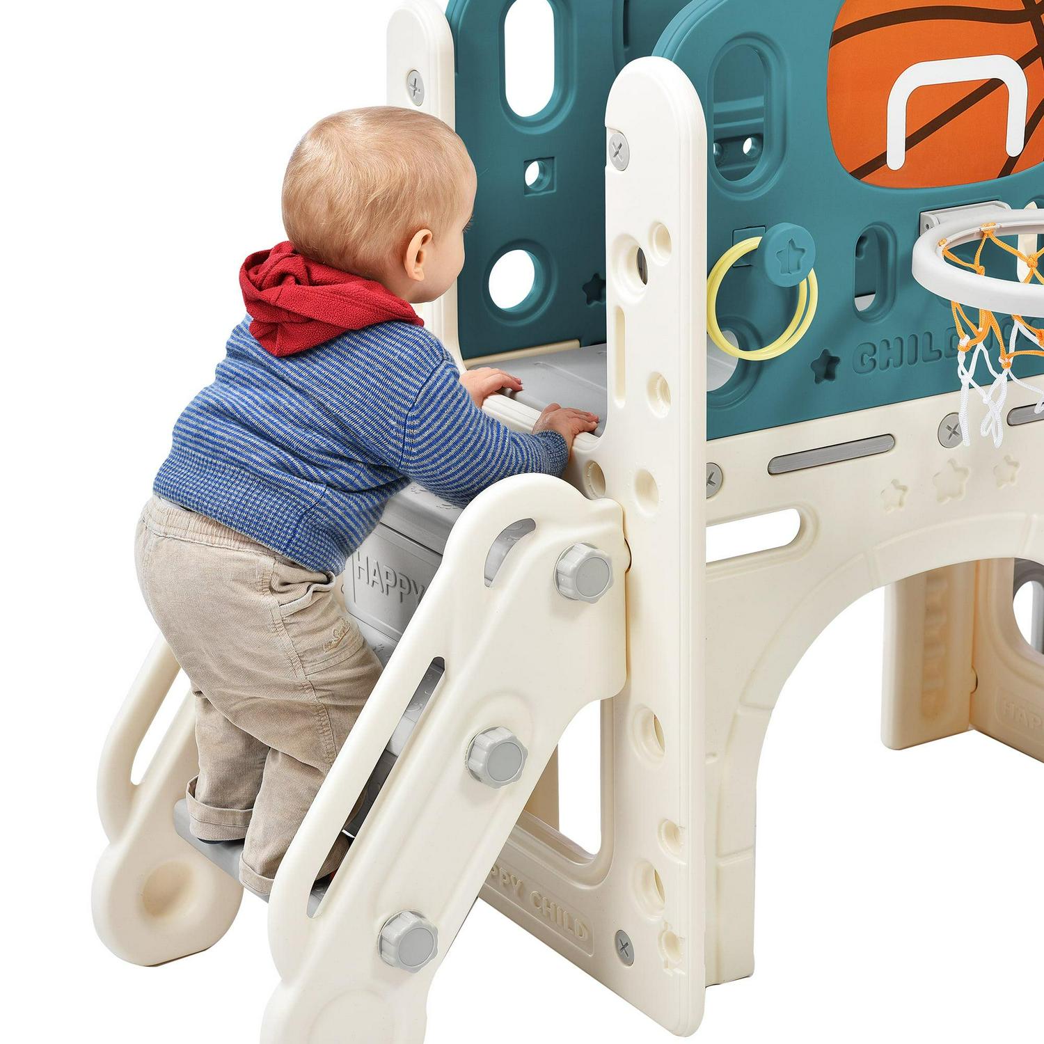 7 IN 1 Slide Set This slide playset structure includes 7 main play parts which are kids’ favorites: a step ladder to climb, a smooth slide to rush down freely, a basketball hoop and a toss ring to play, an arch tunnel for crawling, a toy telescope, and an organizer compartment to hide and store their own small toys.