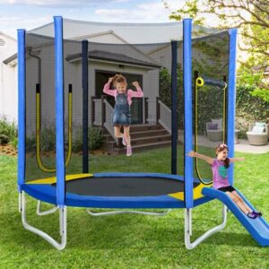 Popular 7FT Trampoline 7′ x 6.6′ (without slide)|Frame to floor height: 15.8”|Slide Size: 27.6”(L) x 15.8”(H) x 15.7”(W)|Free Cushion Size: 15.6” x 12”|Includes all necessary tools and hardware for easy and fast assembly.