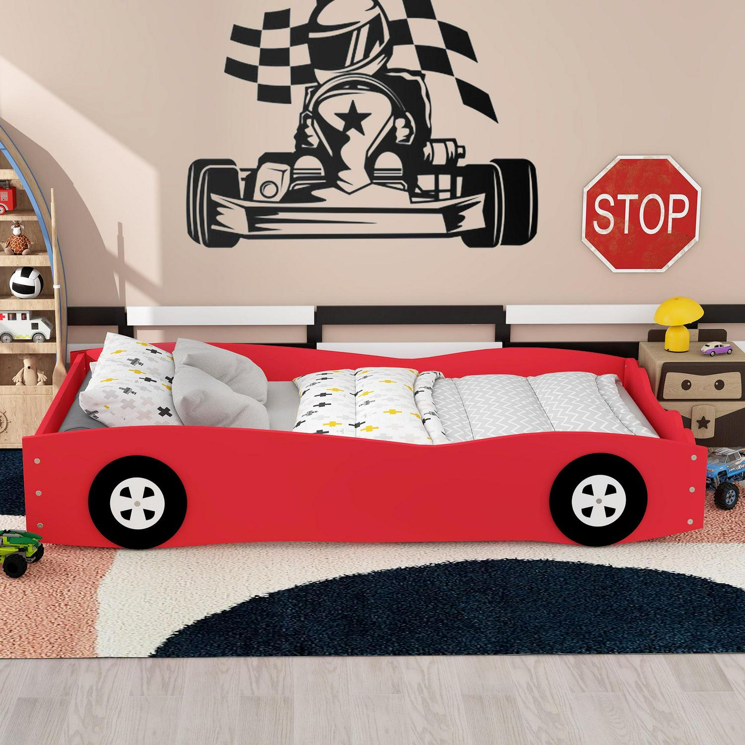 Hope to get a surprise for your lovely children This unique car bed is ready for you. Bedtime just got more fun with this car-themed bed! Your mini car driver will enjoy the realistic look and space to spread out in their own twin-sized bed. This cool bed frame features tires, rims, and front lamps that look just like a real car. Any automotive fan will be excited to fall asleep in this bed after exciting playtime, pretending to be a car driver! Low platform bed design will suit little kids and high guardrails will protect kids all the time. The combination of red and black will add your kids bedroom.