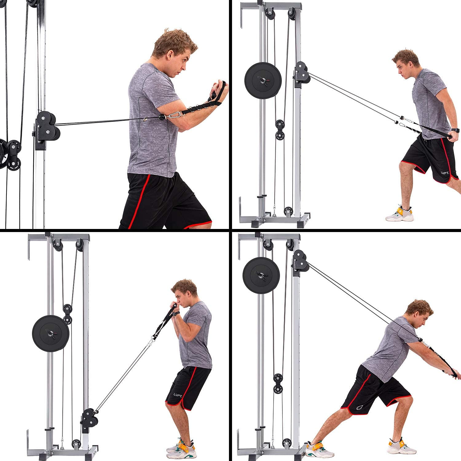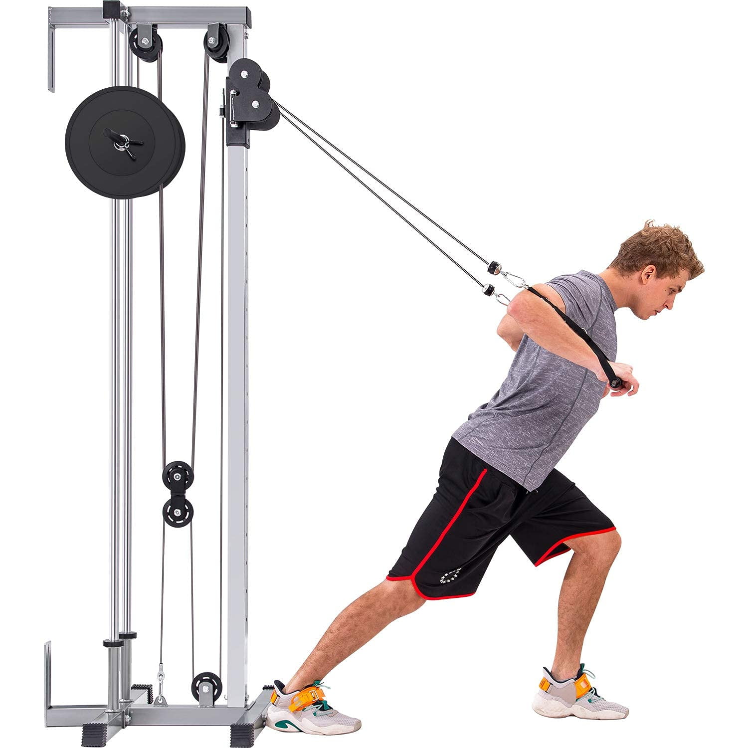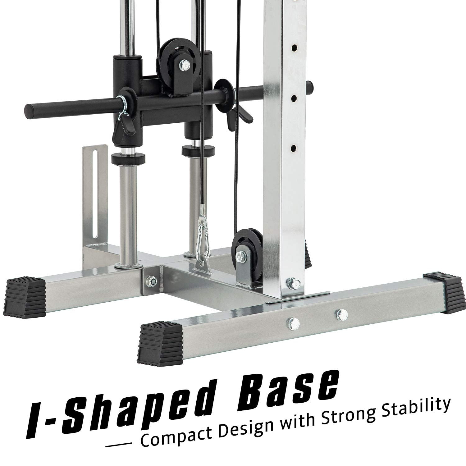 Heavy Duty Cable Machine: The Functional Cable Machine is made of high quality steel and is a sturdy and durable piece of equipment in your home gym! It has a rubber base cover wrapped around each foot to provide further safety and protection for your gym floor! The rubber base cover that wraps around each foot provides further safety, stability and protection for your gym floor. You also have the option to mount this cable crossover on the floor for further stability (hardware included). Versatile Trainer: A full-featured cable machine for your home gym! This machine has a drop bar, adjustable rollers to fit your height, and locks you into a position suitable for high pulley work. The roller will prevent your body from being lifted by the resistance on the bar. Common exercises include cable crossovers for chest workouts, in addition to cable curls, upright rows or low rows, and pull-ups or pull-ups for total body workouts! Work Your Arms and Back: Weight on the plates and use high pull-downs to work your upper body and back muscles, such as the latissimus dorsi. High and low pulley stations are great for safely and effectively working biceps, forearms, latissimus dorsi, shoulders, trapezius and triceps. Pull-down Exercise Machine Dimensions: The machine has an overall height of 80 inches, a length of 25.5 inches and a width of 24.5 inches. Weighing 59.5 lbs. The sturdy steel frame is designed to withstand a lifetime of intense workouts, and the smooth powder-coated paint will stay fresh for years to come.
