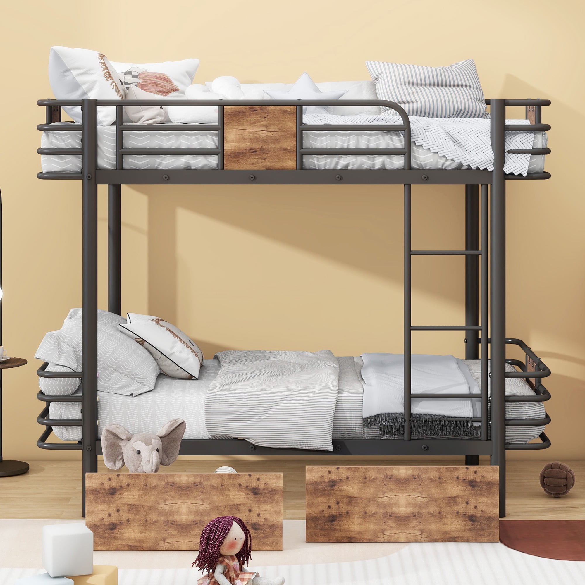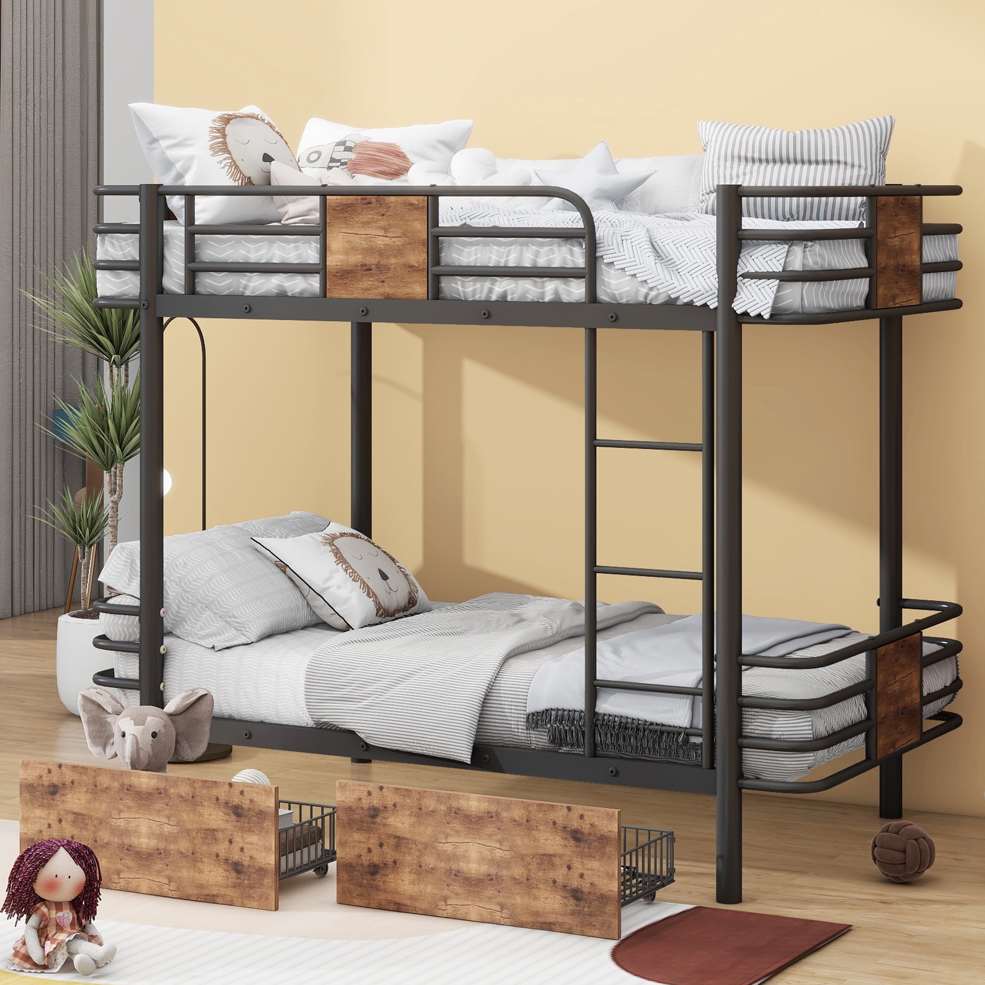 Features: Large storage space: Two drawers under the bed, you can storage the cloth or somthing in it. The surface is made of wood. It inhance the beauty of this bed. Superior Quality: The bunk bed is constructed with a sturdy metal frame that can enhance stability and durability. Slats are included, you don’t need to prepare box springs or foundations Easy Assembly & Complete Service: The bed frame comes with detailed instructions, assembly tools, and numbered parts, assembly can be done within 1h. Finish option: Black Dimensions of bed: 81.5”L x 41.3”W x 66.3”H Total height: 66.3″ Recommend Mattress Thickness of Bed: 6″ Spring box: No Need Assembly required: Yes