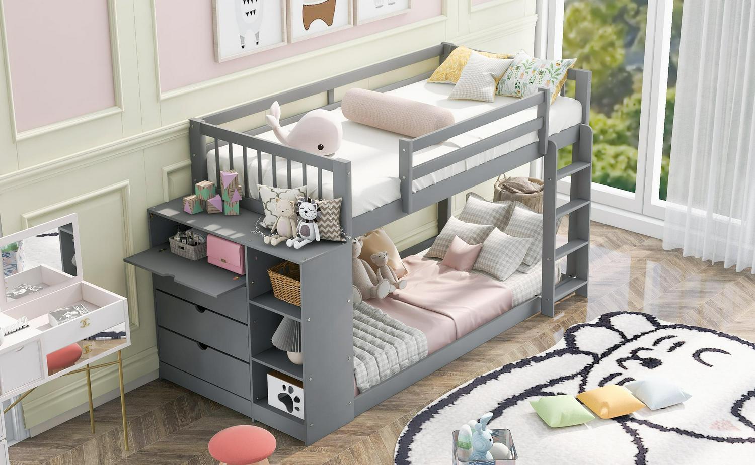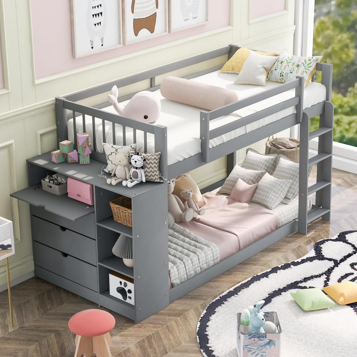 – [Space-Saving Design]: There are two beds in total, twin upper bed and twin size down bed, which will suit a family with more kids. There is a four-tier cabinet and shelf attached to the bed, and you can put toys, books, and other accessories in it.