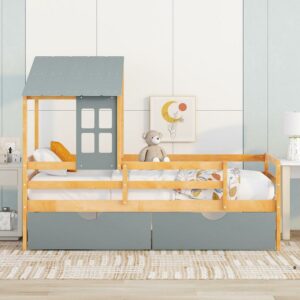 Euroco Wood House Platform Bed with Roof and 2 Drawers for Kids Room, Semi-Close House Bed with Roof and Window, Gray