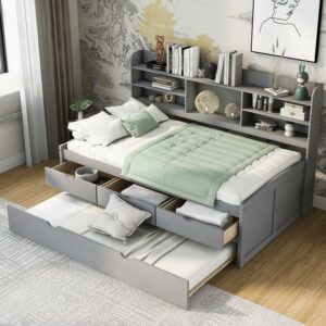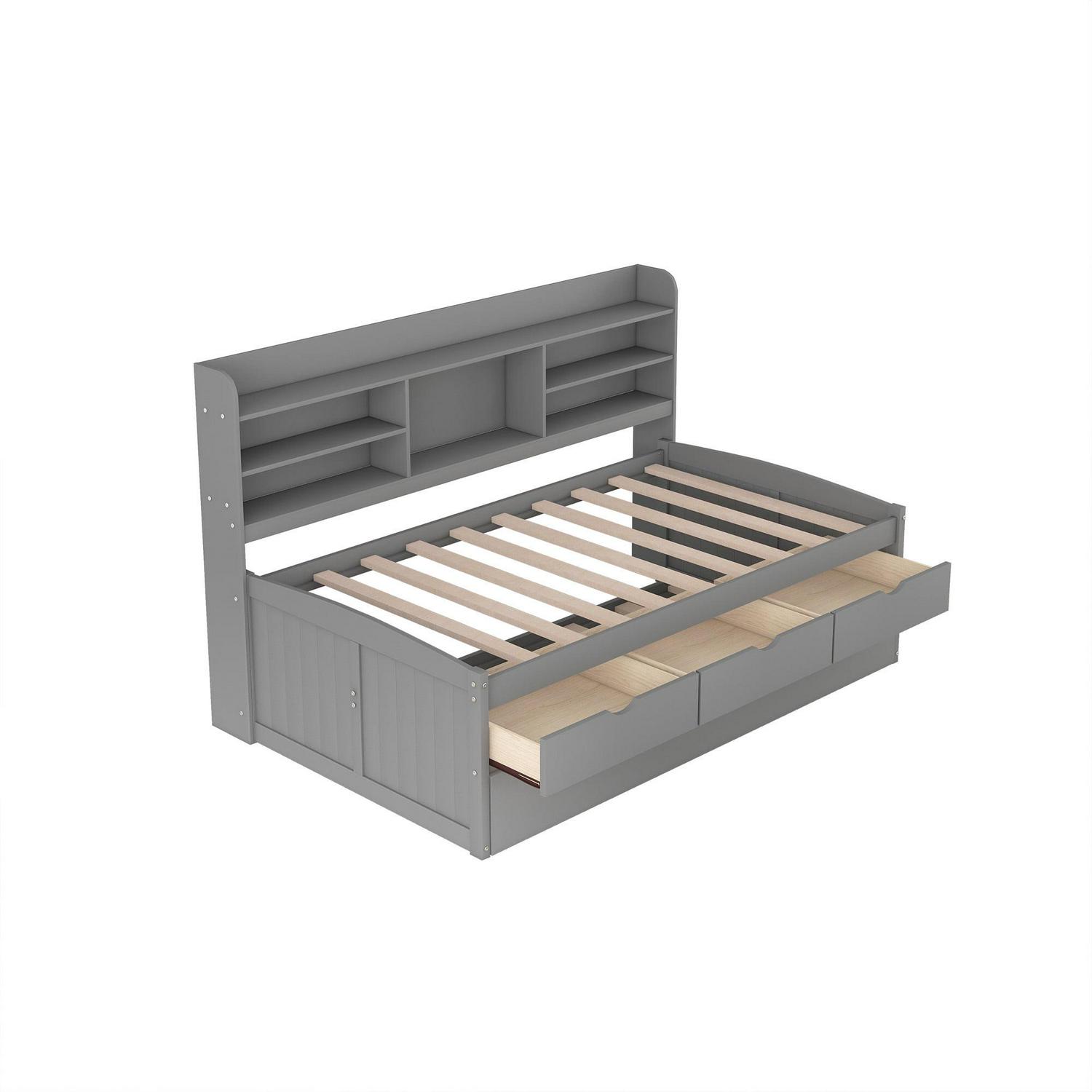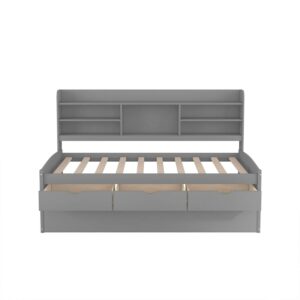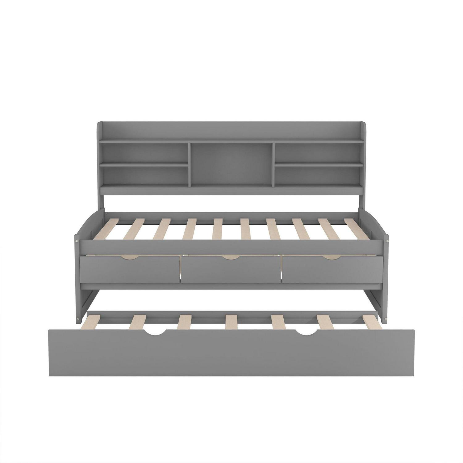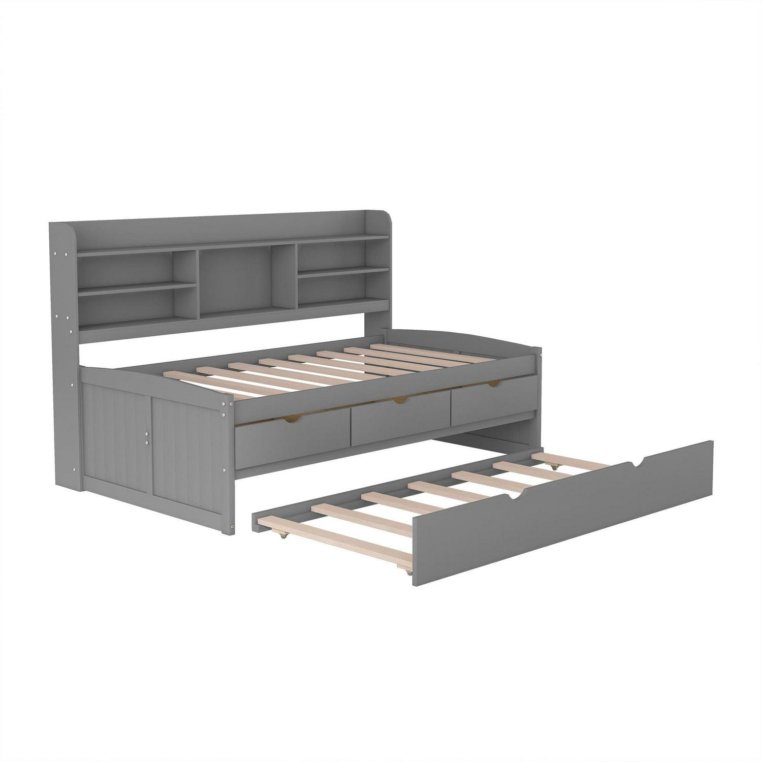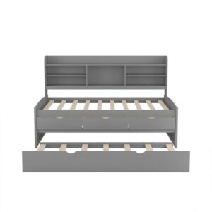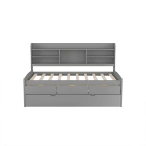 Euroco Wood Twin Size Daybed with Shelf, Trundle and Drawers, Wood Captin Platform Bed with Staorage, 3 Drawers and Trundle, Light Gray