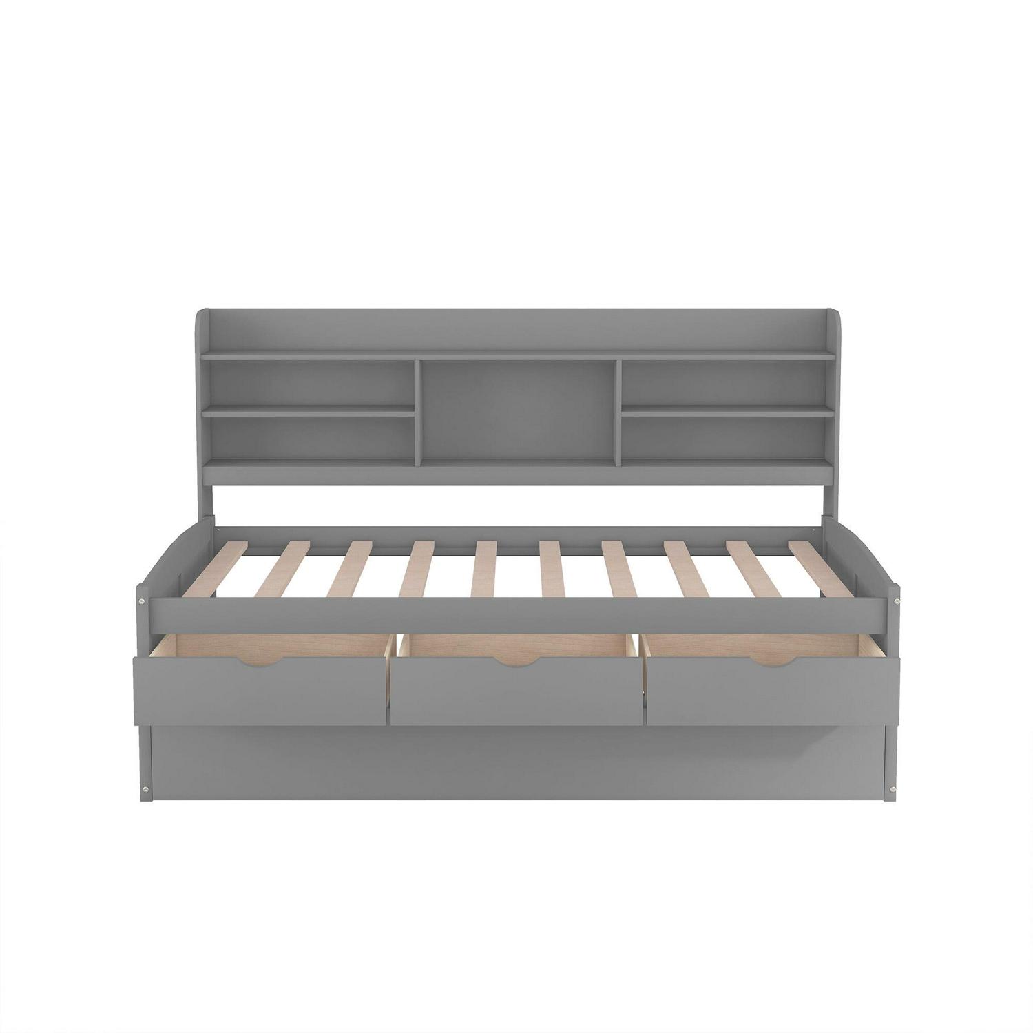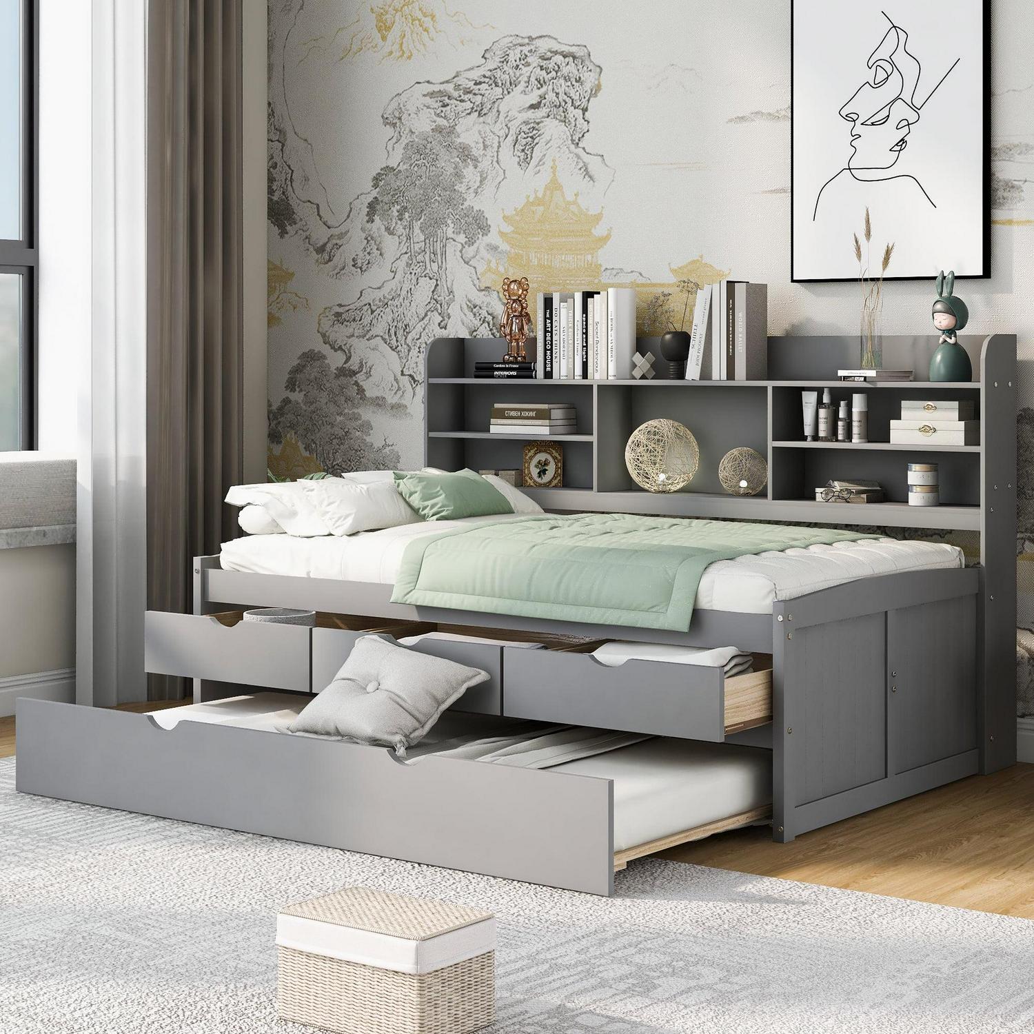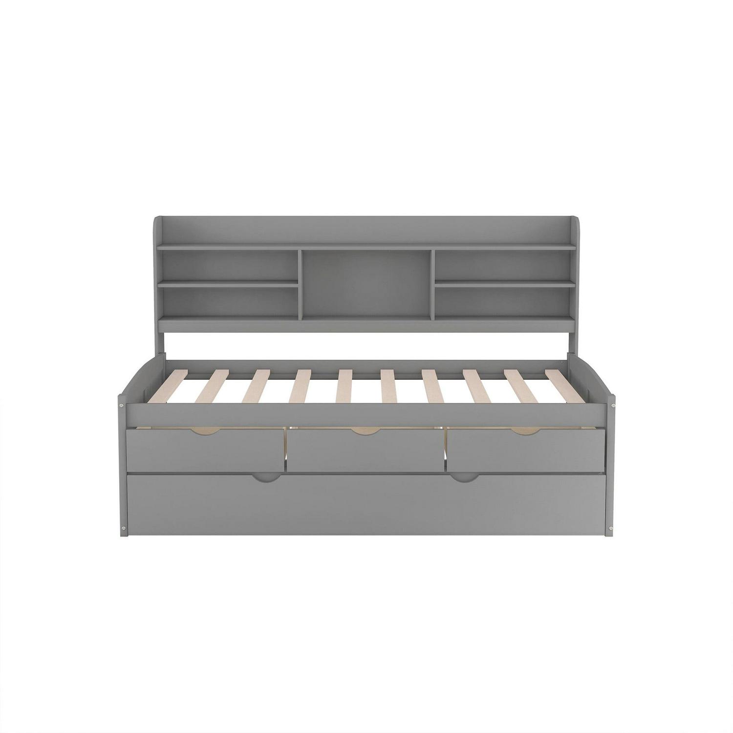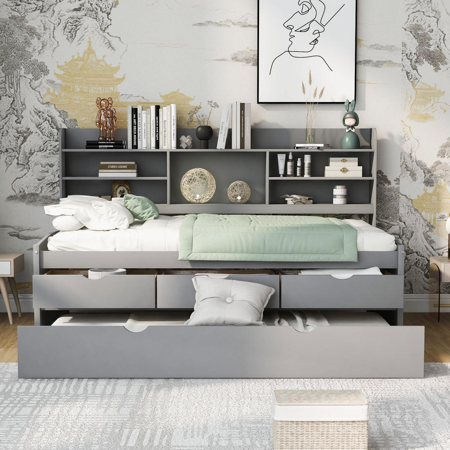 Whether you re a busy professional in need of a perfect small space solution for your condo or home, or cool and functional furniture for your dorm or first apartment, this multifunctional daybed has you covered. Our unique and functional furniture has a three tier shelf, three drawers and a twin size trundle, providing ample storage room for you to store books and clothes. Made of solid pine wood, this bed will stand the test of time and last for years.