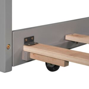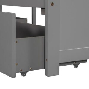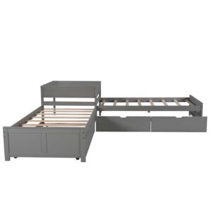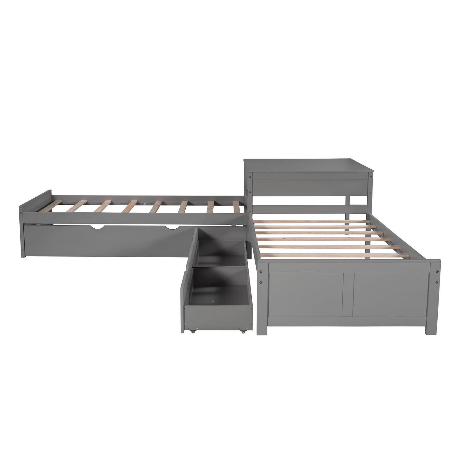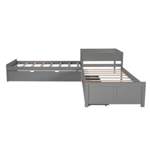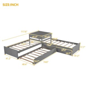 Euroco Wood Twin Size L-Shaped Platform Bed with Square Storage Table for Kids, 2 Platform Beds with Trundle and Drawers for Living Room, 3 Twin Beds, Gray