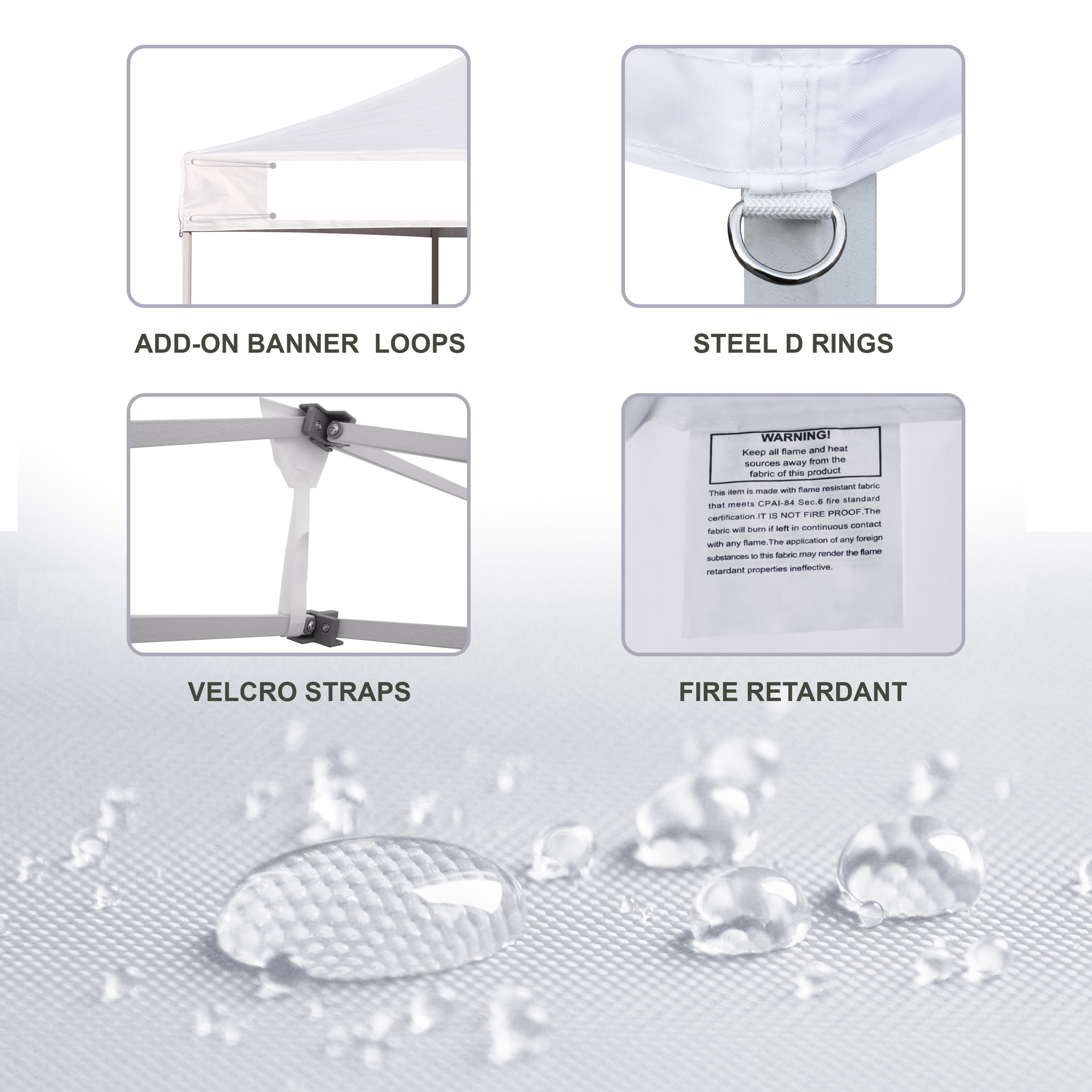 Fits Most Standard Canopy Frames: Compatible with most standard canopy frames featuring 4 straight legs, such as Ez Pop Up Canopy and Caravan canopy. High-Quality Materials: Made from extra thick 500D polyester fabric with CPAI-84 fire certification, it offers 99% UV protection, UPF50+ rating, and water resistance. Front valance includes banner loops for hanging your banner. Convenient Features: Horizontal Velcro on all 4 valances for easy sidewall attachment. Metal D rings in the corners provide added strength and secure guy ropes. Velcro at the 4 corners of the top ensures a secure attachment to the frame. Please Note: Canopy top cover ONLY, frame NOT included! Includes bonus 4 weight bags.