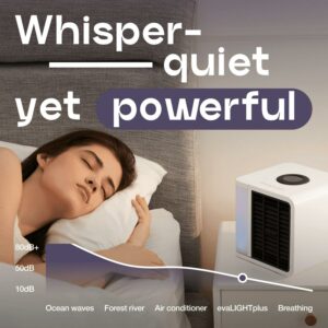 – PORTABLE EvaLIGHT Plus evaporative air cooler are portable and whisper-quiet (up to 45bB), and can also be powered via USB from power banks, laptops and a car power outlet with a capacity of at least 2A 5V. No installation needed so you can move with comfort and feel the ocean breeze wherever you go, whether you are traveling, working, studying or just chilling at home.