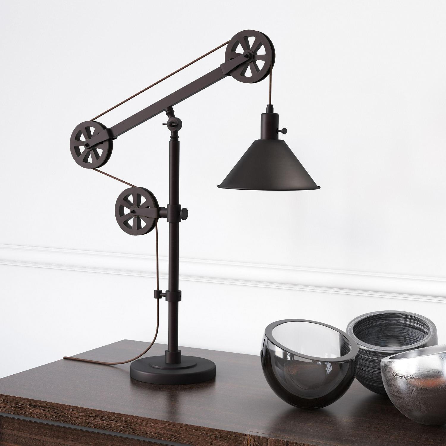 This unique and eye-catching industrial table lamp is made to be the center of attention on your bedroom nightstand, bedroom, living room, dining, or even your study and office. It’s a conversational modern twist on a traditional and classic design. Hand crafted from metal in a deep contemporary blackened bronze, brass, or steel finish and featuring a functional adjustable pulley system, this will be the centerpiece of any room.