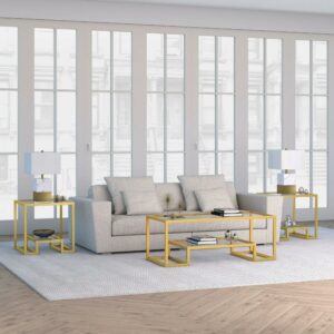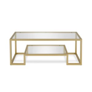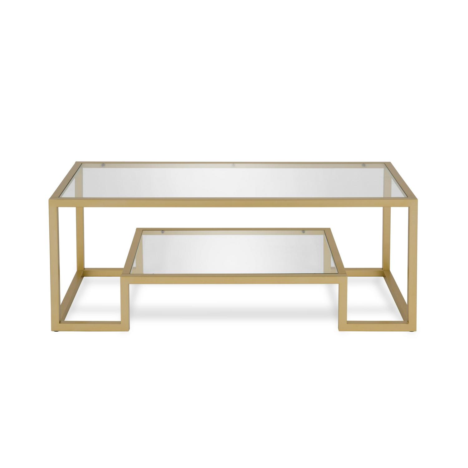 The geometric shapes of this coffee table add to its Hollywood Regency appeal and overall glam look. Form meets function as the lower shelf is stylishly raised to offer additional shelf space. It seamlessly fits into any room with its glamorous gold finish.