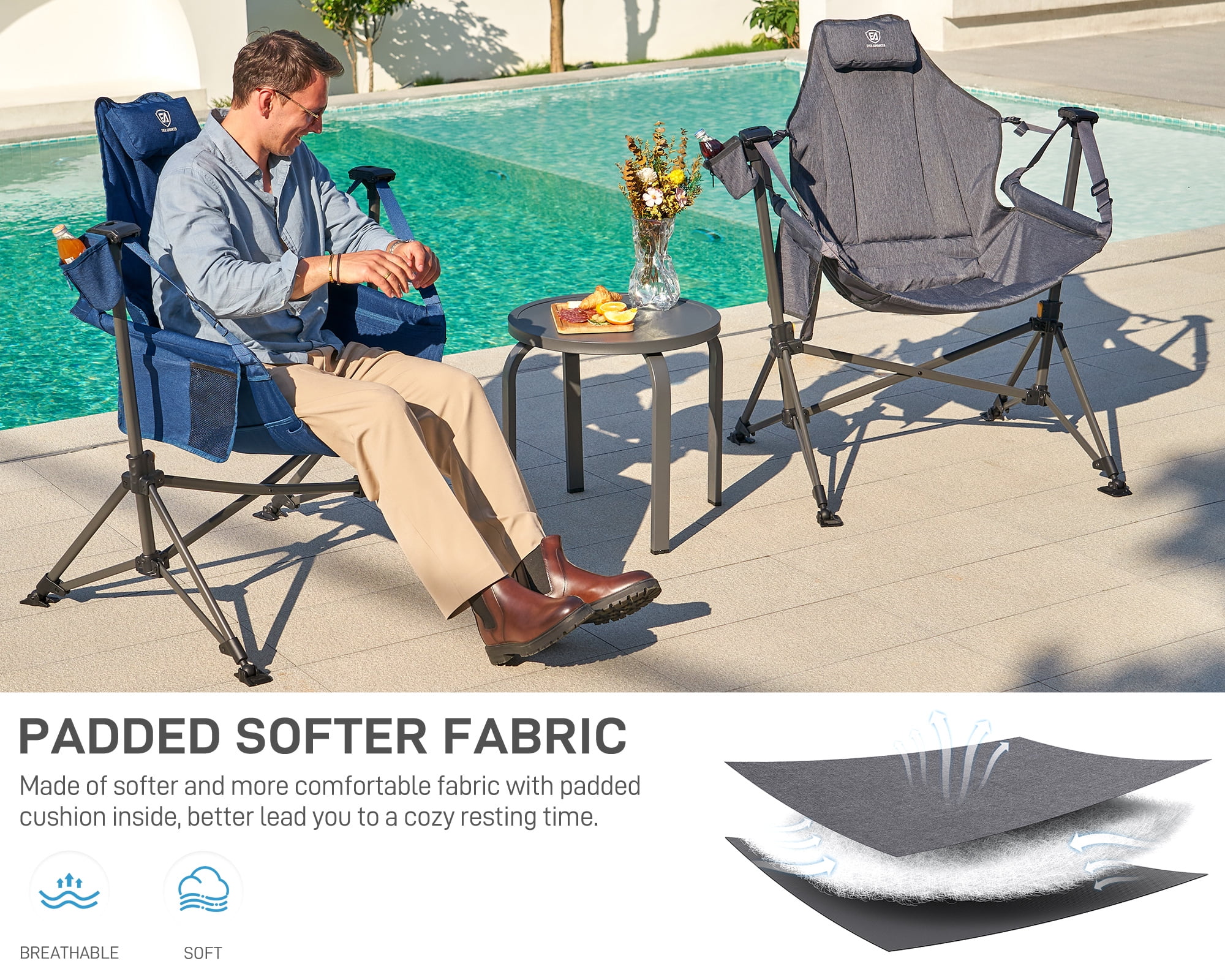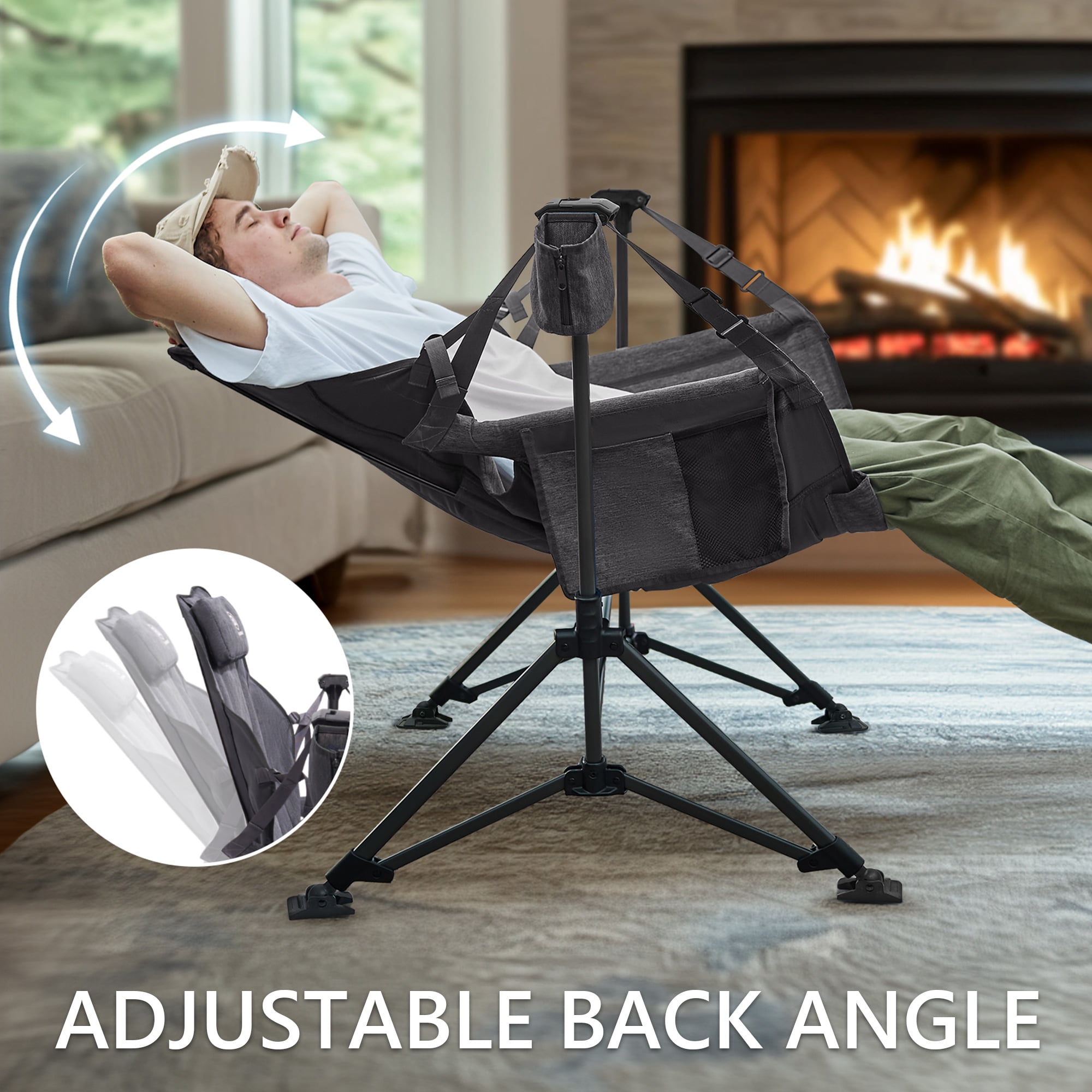 PADDED FABRIC: The seats and backrests with thick padded lining are more comfortable than other folding camping chairs, and sitting for a long time will not make you feel tired. Spacious seat area allowing you to sit freely, even cross legged or swinging without restrictions. ADJUSTABLE SEAT & BACK: Our hammock chair is designed with adjustable angle seats and backrests.You can enjoy better rest, accompanied by various adjustable postures from sitting to lying down. HEAVY DUTY: This outdoor folding chair is made of thickened metal pipes to create a frame, and durable fabrics to create the surface of the chair. This makes it more durable and stable. The maximum load-bearing capacity is 350 lbs. EASY TO SET UP: The folding outdoor swing chair can be set up in two minutes without the need for additional tools. Please connect the plastic parts on both sides of the armrest to the top of the bracket. MULTI SCENARIO: This Hammock chair is suitable for outdoor scenes such as camping, courtyards, decks, etc. It can also be used as a good companion for indoor reading and resting. MULTI SCENARIO: This Hammock chair is suitable for outdoor scenes such as camping, courtyards, decks, etc. It can also be used as a good companion for indoor reading and resting.