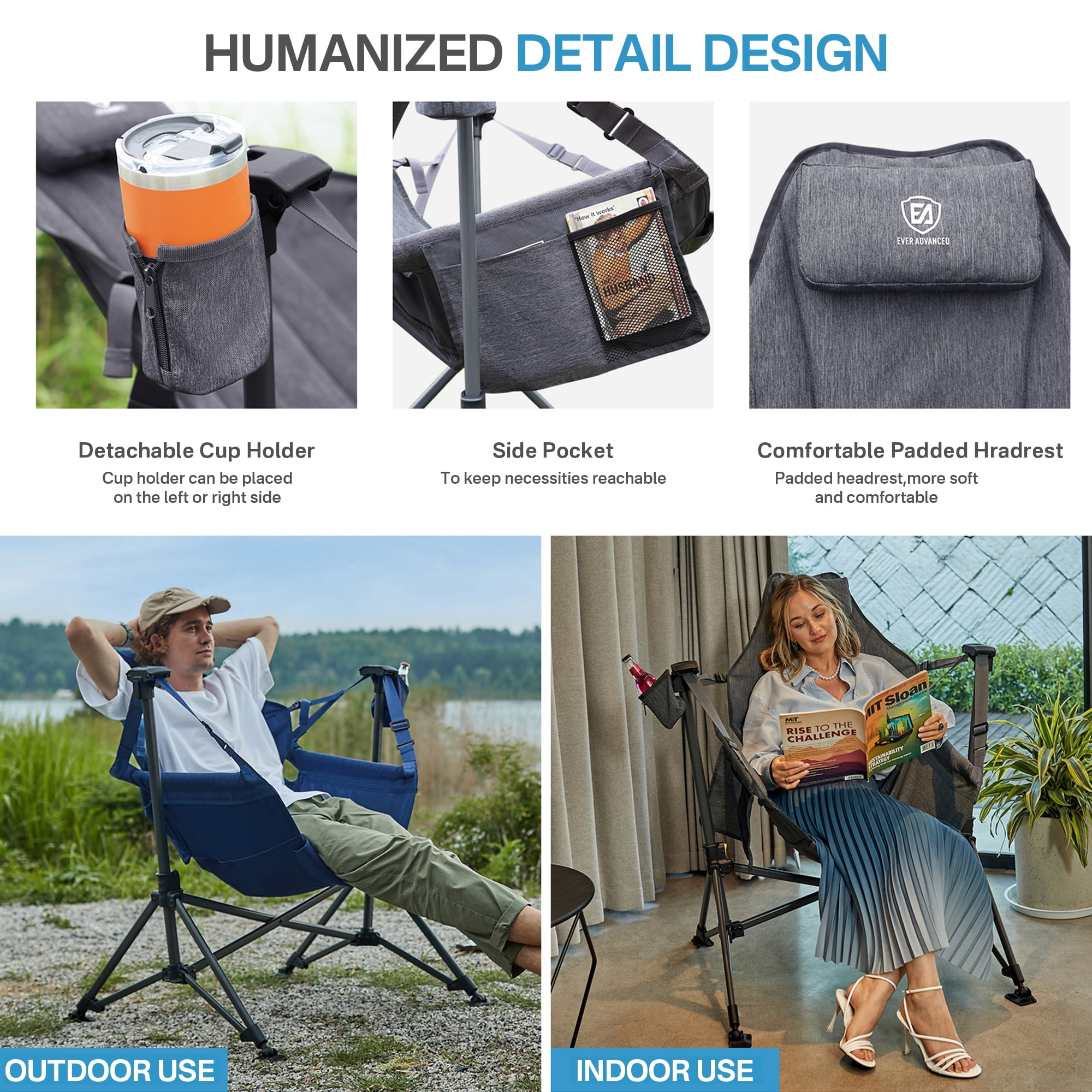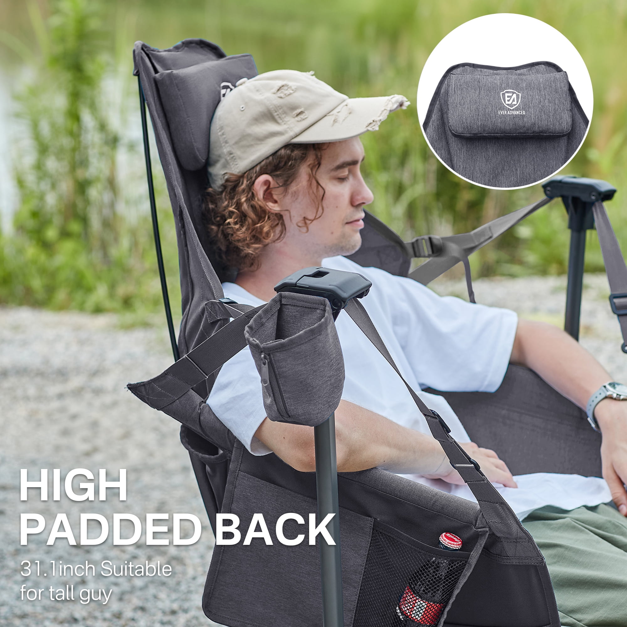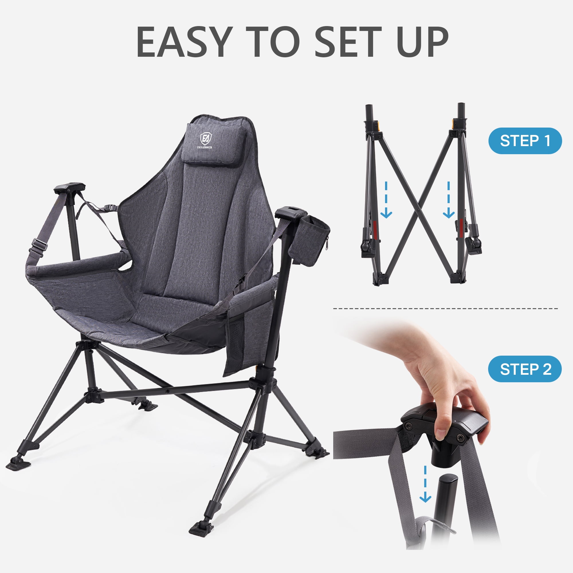 EVER ADVANCED Padded Camping Hammock Chair for Outdoor with Adjustable Back and Seat, Folding Swing Chair with Steel Stand, Cup Holder, Side Pocket, New, Grey