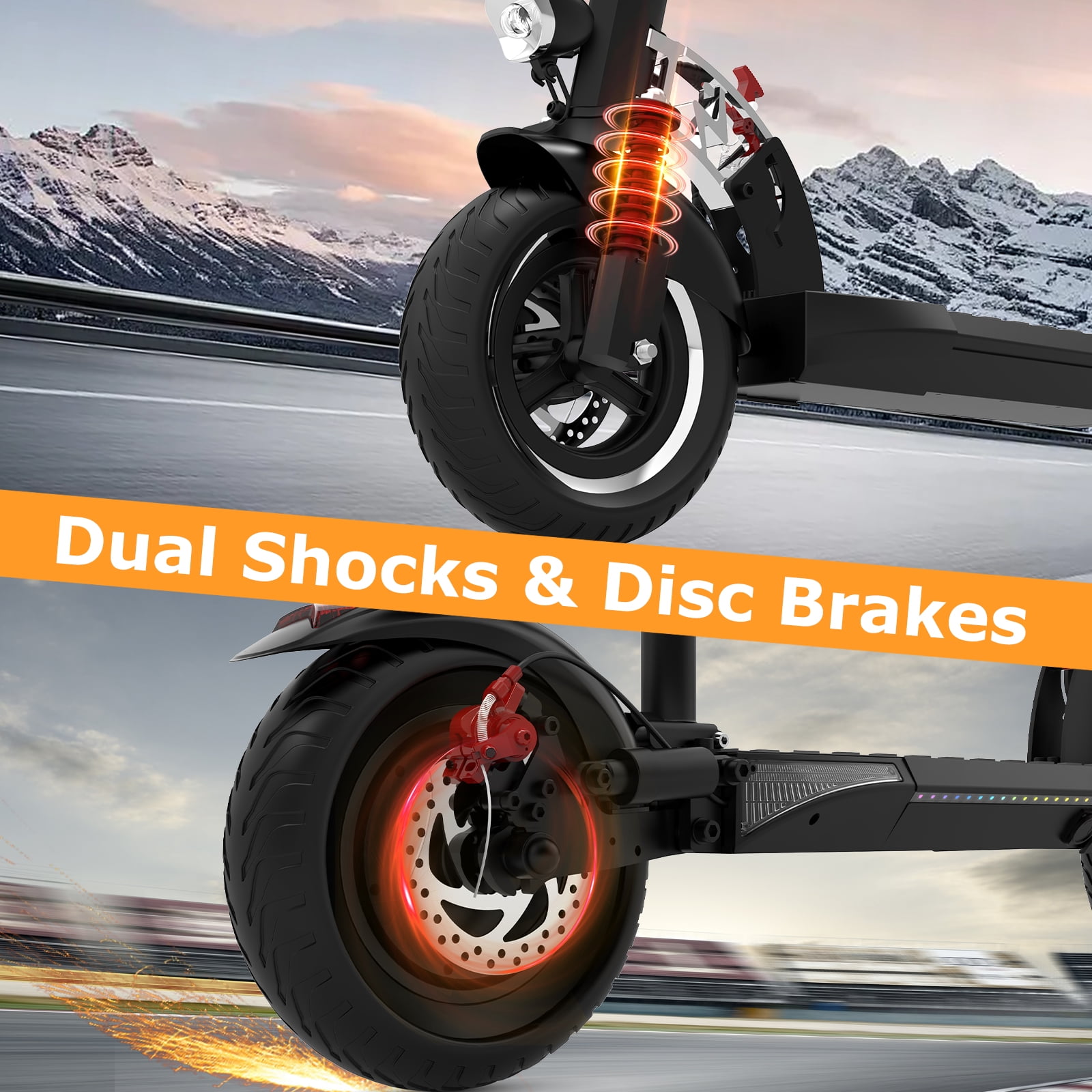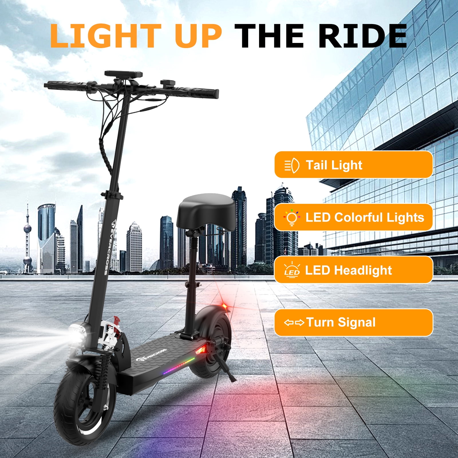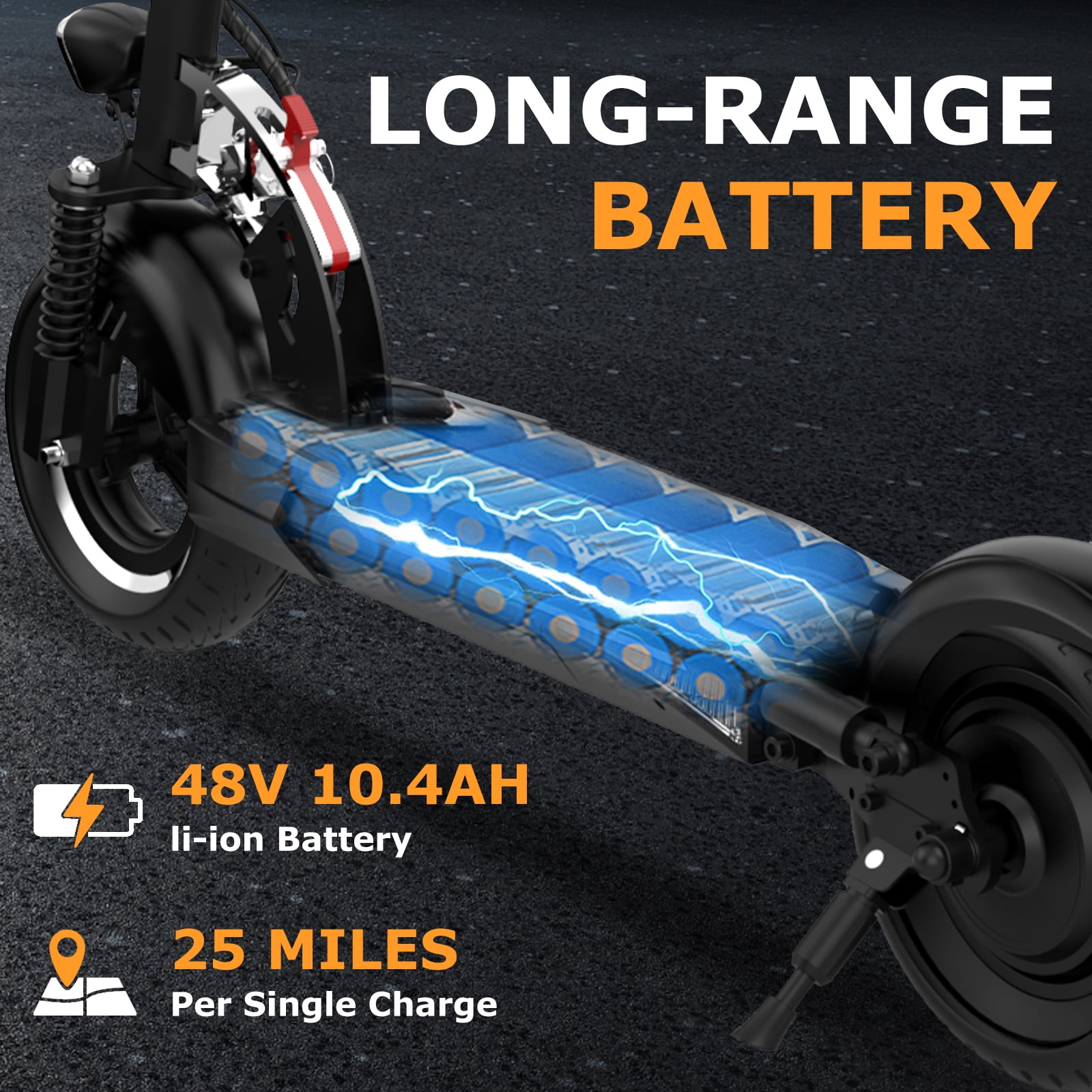 Equips an upgraded powerful motor,owning a 28 MPH max speed and a range of 25 miles, max load up to 330 lbs Dual front and rear disc brakes, quick respond braking also safer for emergency braking Come with a soft seat and dual shock absorption system for your comfort driving With 1-second foot-actuated folding, easy to carry and storage Cruising at a constant speed makes you more relaxed, 3-speed modes of your choice Clear LCD display shows the battery, headlight, cruise indicator, gear indicator, and total mileage for all your need Multi-functional buttons achieve to change the speed, lights, and cruising modes easily Conquers hills with ease Detachable seat design freely stches 2 riding modes E-Scooter With “EVERCROSS PRO” APP Control