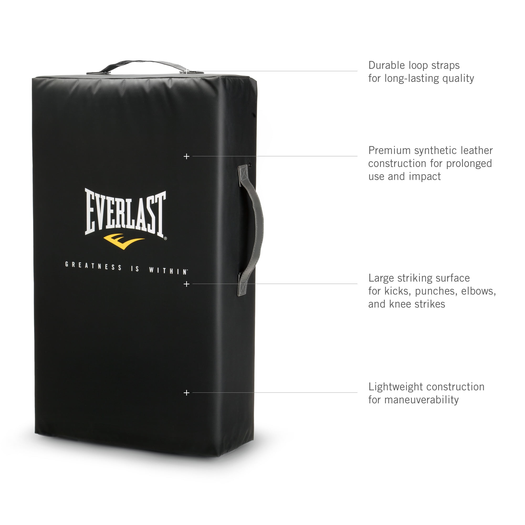 The Everlast MMA strike shield ensures safety and protection. Made of high-density foam and synthetic leather. Multiple straps for functionality. Increase your precision and power.