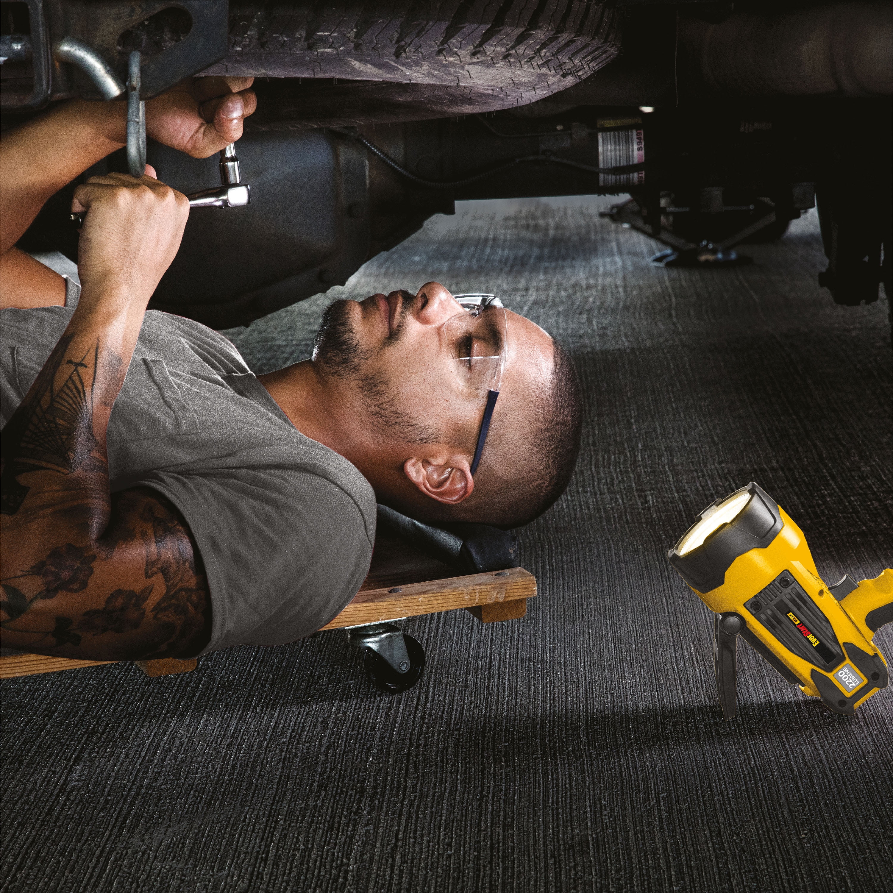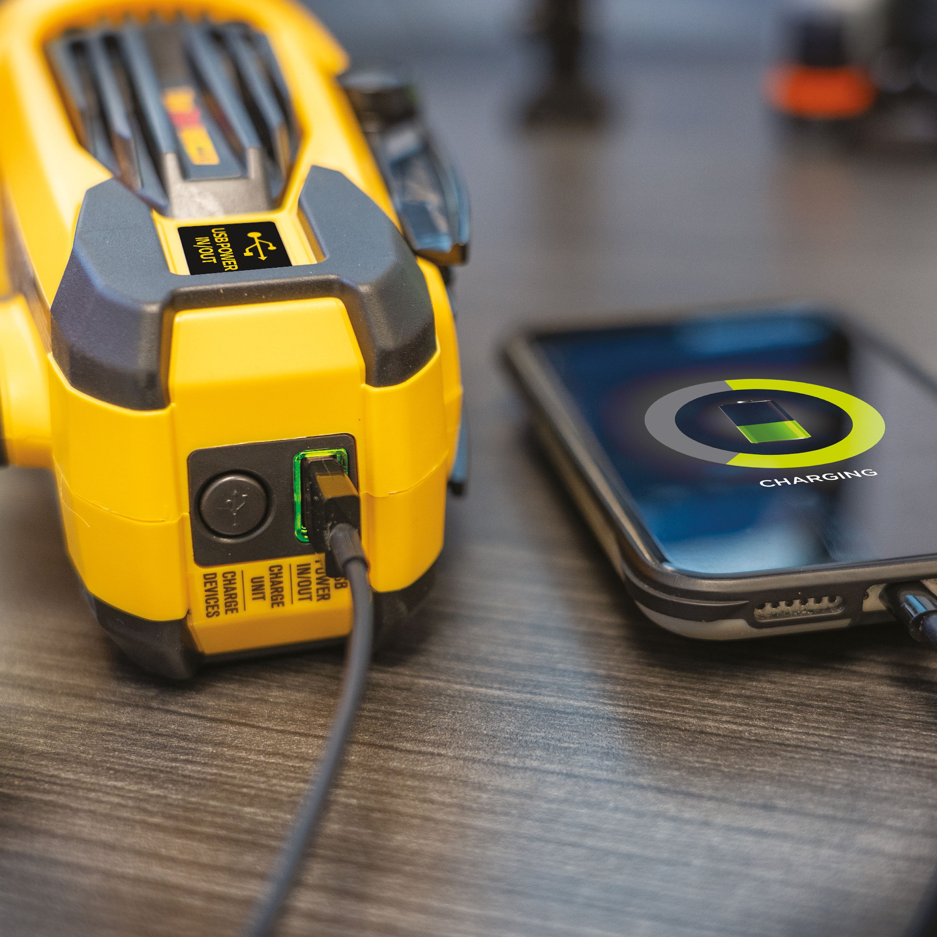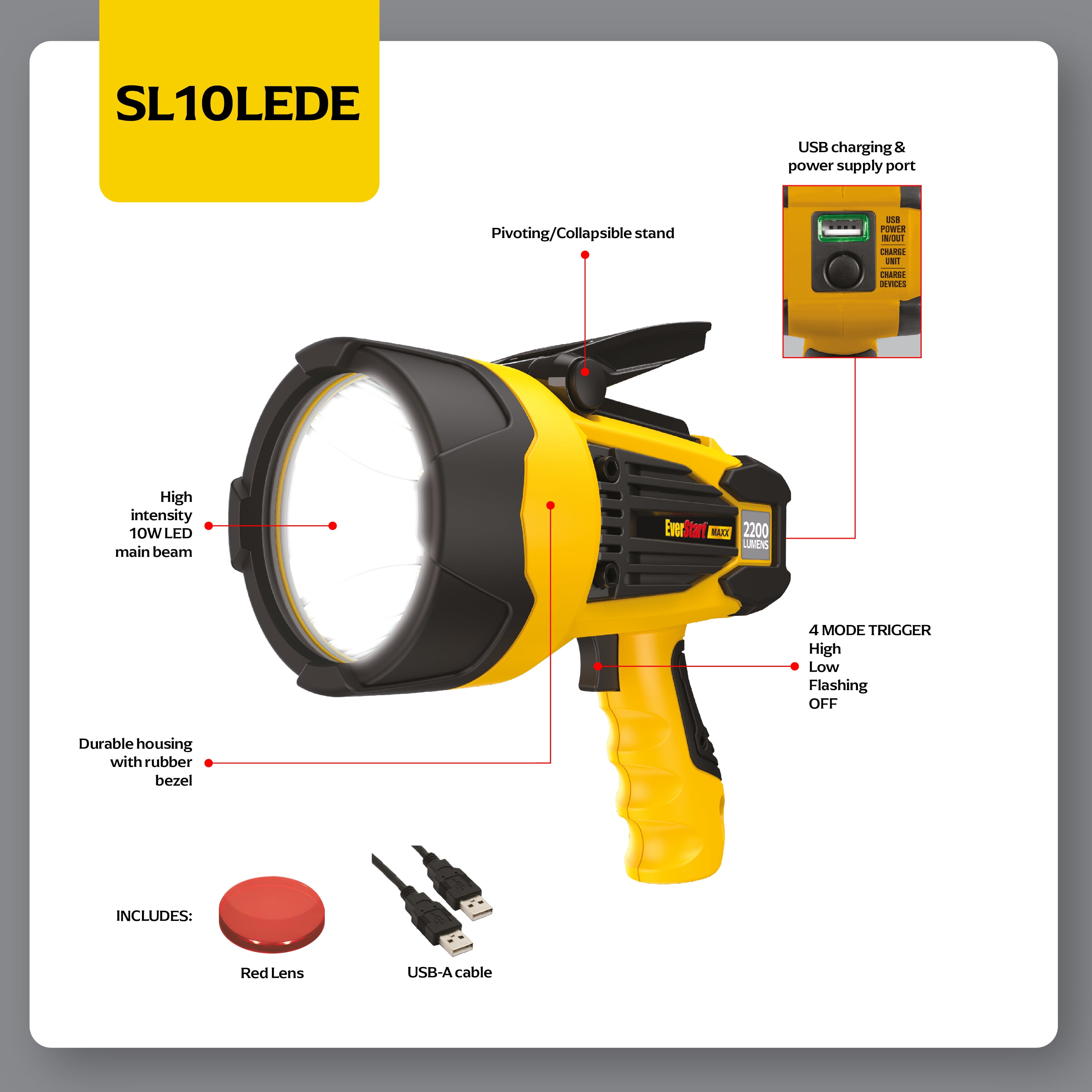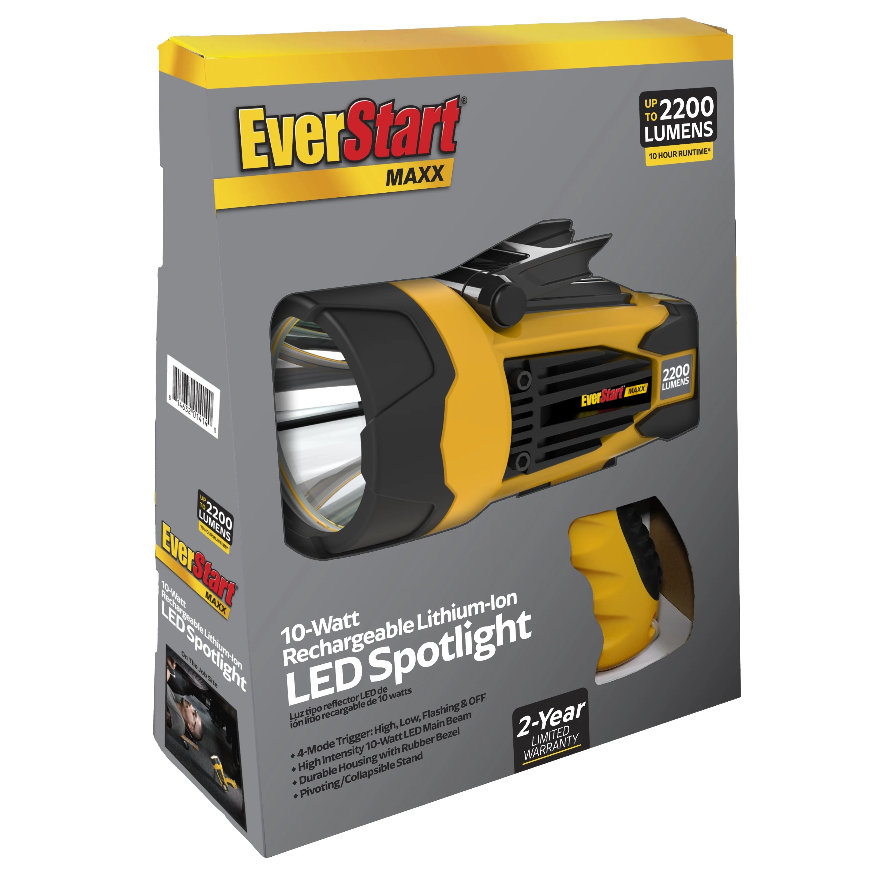 Portable spotlight delivers up to 2200 lumens of dependable LED lighting Up to 10 hours of runtime Handsfree spotlight features a pivoting/collapsible stand USB portable power to charge your devices on the go Ergonomic handle with 3 position trigger power switch for High, Low Emergency Flash and Off modes ncluded battery – Lithium-ion technology allows for up to 12 months without recharging. Questions? Call the EverStart customer service hotline at 1-877-571-2391 or email us at [email protected]