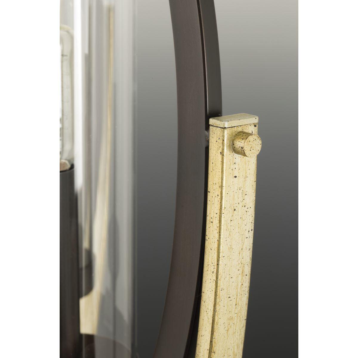 - Elliptical frame supports candelabra bulbs with clear glass shade