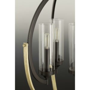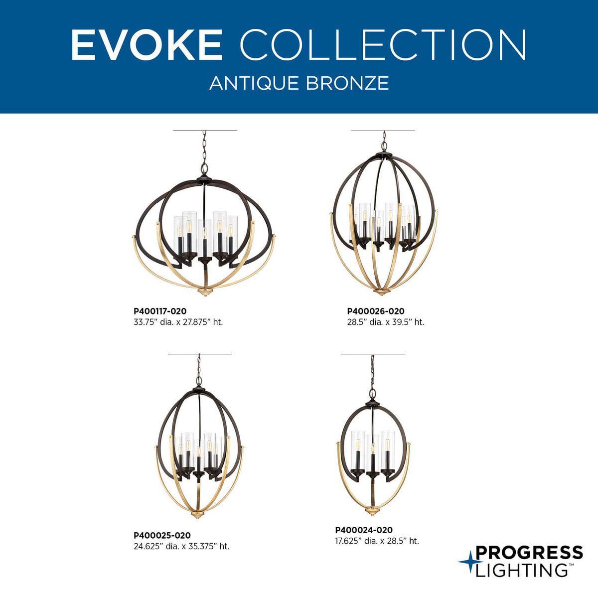Evoke features an elliptical frame that gracefully supports a candelabra with clear glass shade. Mixed finished highlight the unique shape and provide a hint of livable luxury to your home. This six-light chandelier with Antique Bronze finish and Champagne accents is part of our Design Series collections.