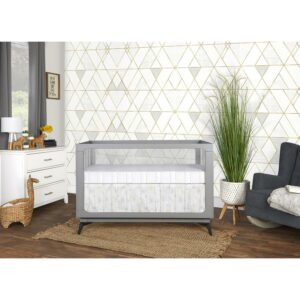 Evolur Acrylic Millennium crib features sleek lines that capture the sophisticated restraint of modernism. This design offers a hit of an industrial element with its silver metal fitted feet, the clear slats provide an airy, open feel that seamlessly blends with your chosen design aesthetic. The Modern crib is designed to converts to a toddler bed and day bed to accommodate your growing child (conversion rails sold separately). This crib can be paired with a mixture of rich warm jewel tones, patterns combing with tasteful furniture creates a fun and cheery nursery.