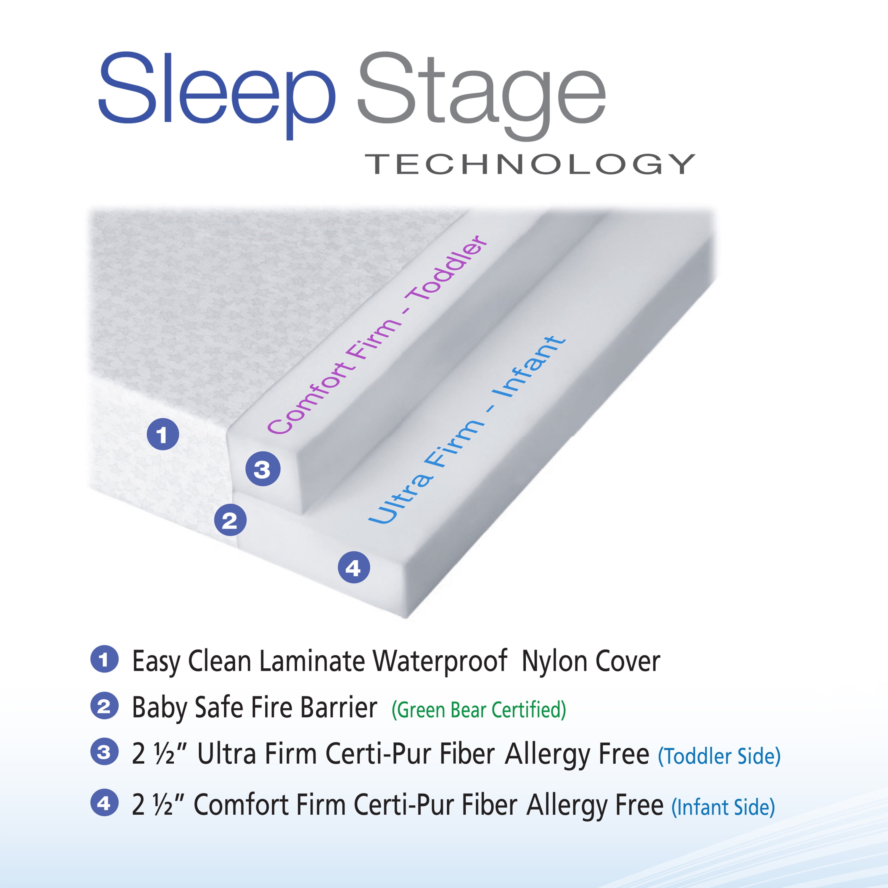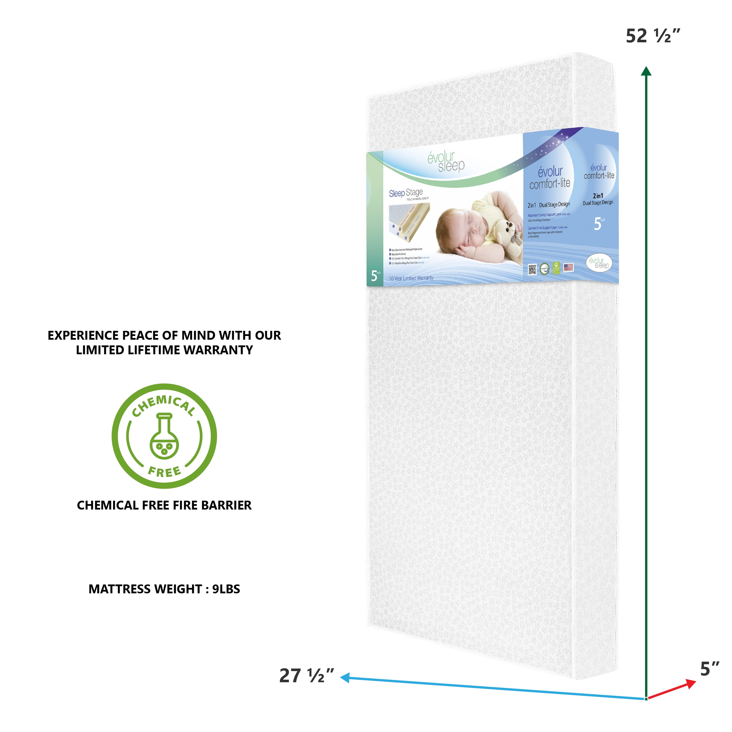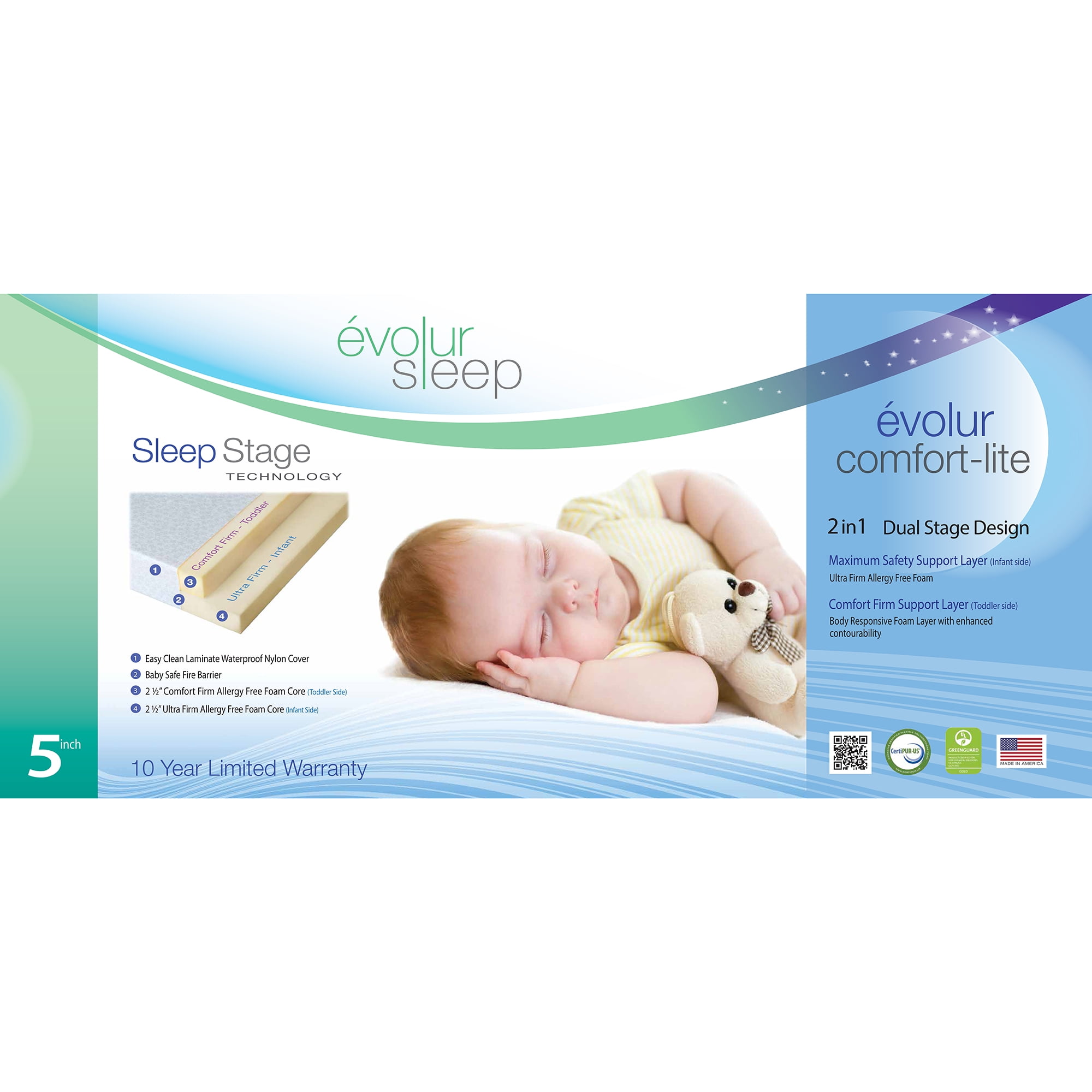 Evolur Sleep Dual Stage Comfort-Lite 5″ Foam Crib and Toddler Mattress, Silver Star: Cover: Silver Star vinyl laminate cover with soft cloth binding keeps liquids, bacteria, bed bugs and dust mites out yet allows air to flow in Inner layers: 2-1/2″ Ultra Firm CertiPUR-US Certified Foam Infant Side, 2-1/2″ Comfort Support CertiPUR-US Certified Foam Toddler Side Dimensions: 52-1/2″ x 27-1/2″ x 5″ Warranty: 30 Day to factory defects CertiPUR-US approved foam analyzed by independent testing laboratories for content emissions and durability All Evolur mattresses are GREENGUARD Gold Certified for a healthy indoor environment for your baby JPMA certified to meet or exceed all safety standards set by the CPSC and ASTM. Questions about product recalls? Items that are a part of a recall are removed from the site, and are no longer available for purchase. These items include items only, not those of Marketplace sellers. Customers who have purchased a recalled item will be notified by email or by letter sent to the address given at the time of purchase. For complete recall information, go to Recalls.