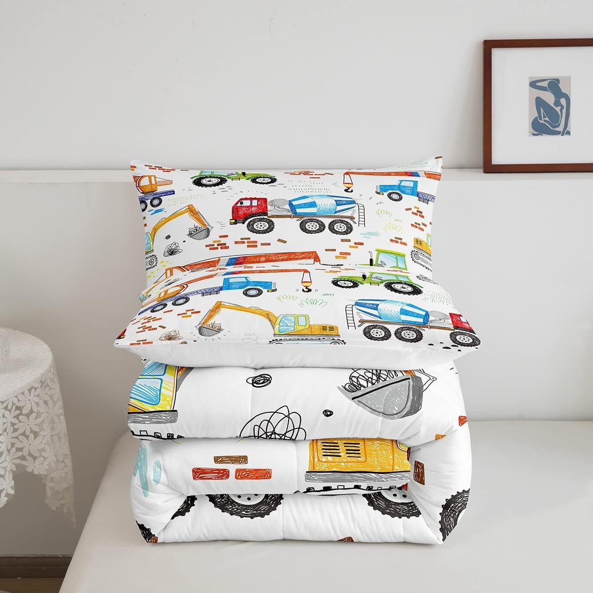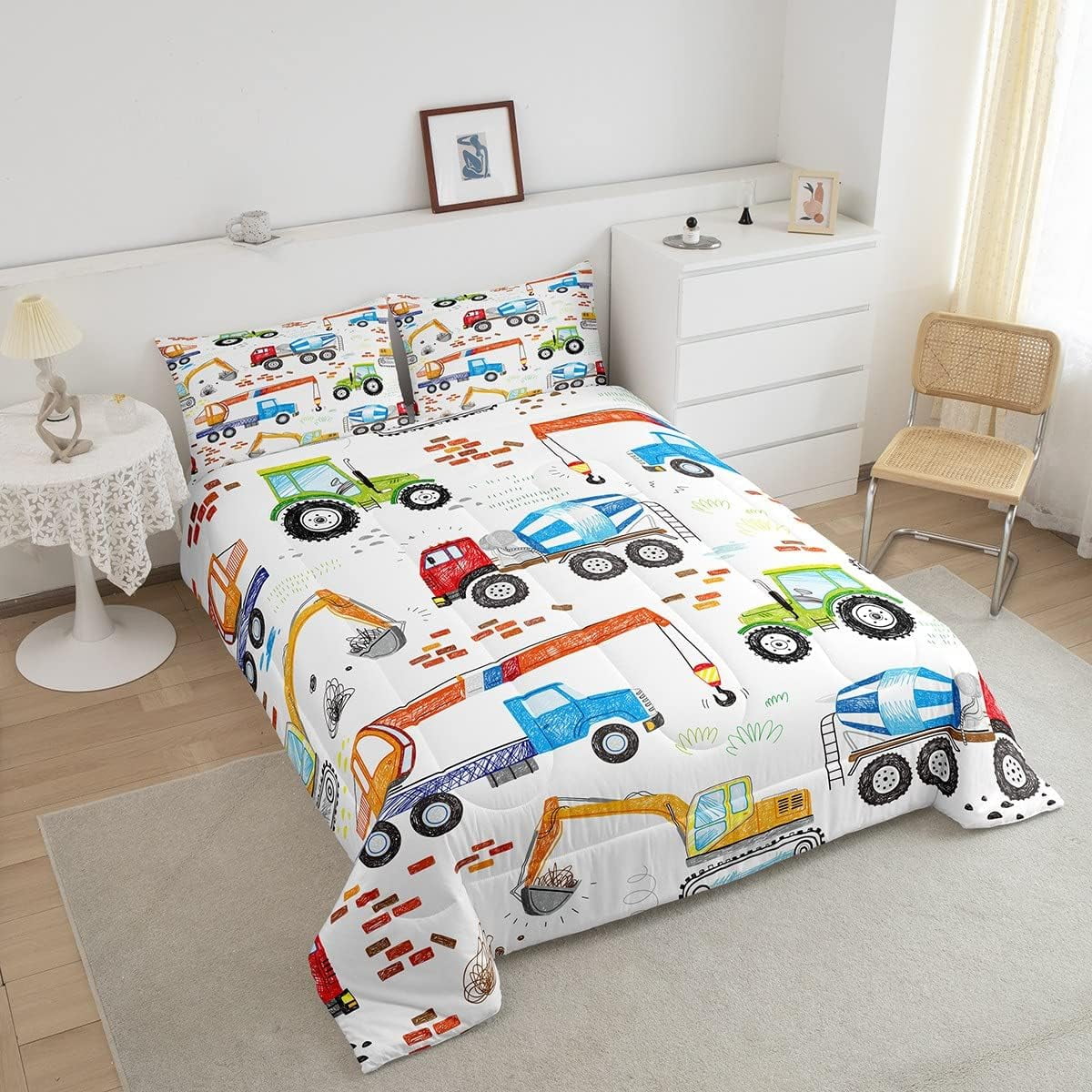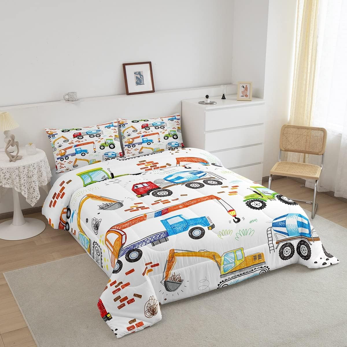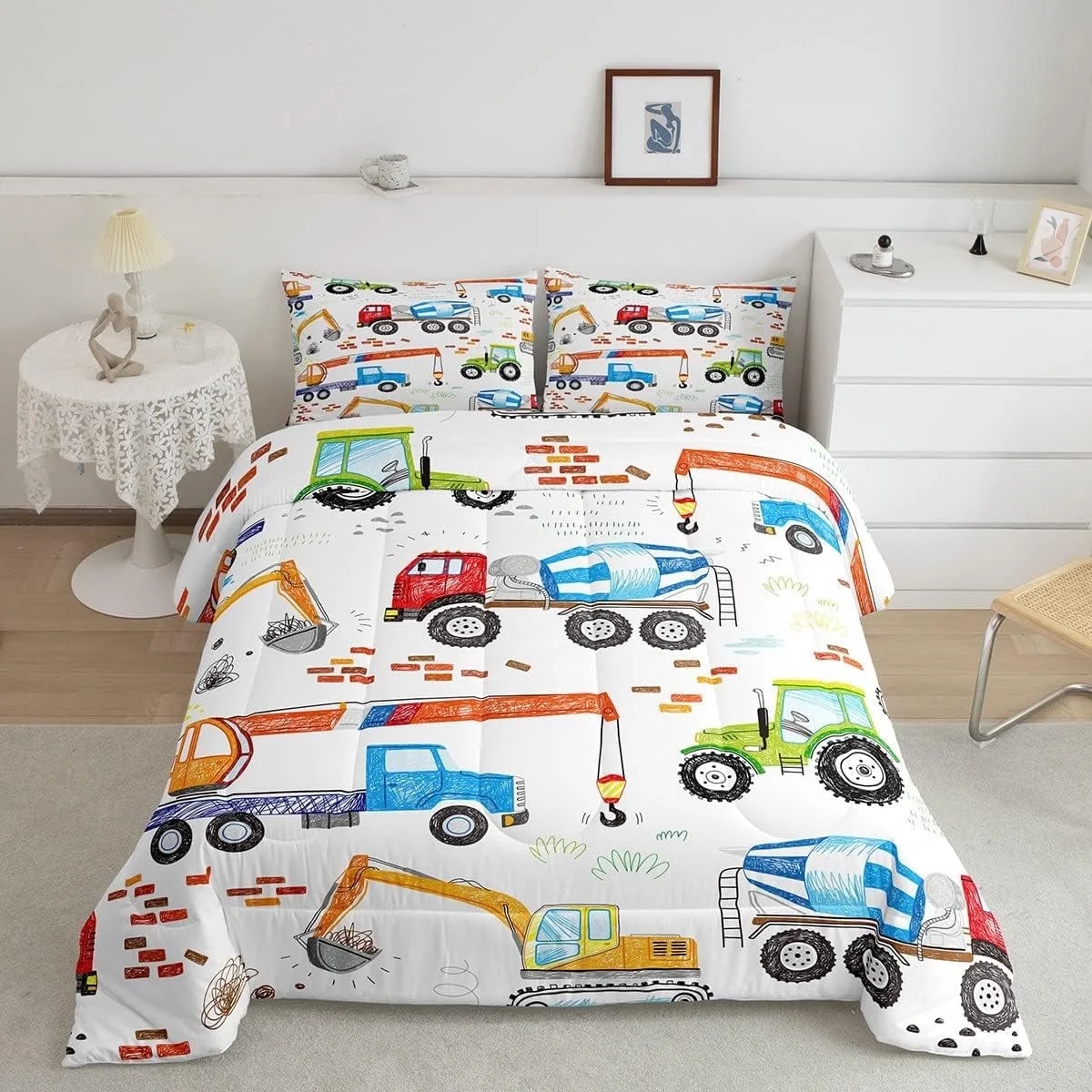 Excavator Comforter Set Cartoon Truck Bedding Sets Construction Vehicle Down Comforter Tractor Cement Mixer Hand Draw Duvet Insert With 1 Comforter and 1 Pillow Case Twin Size