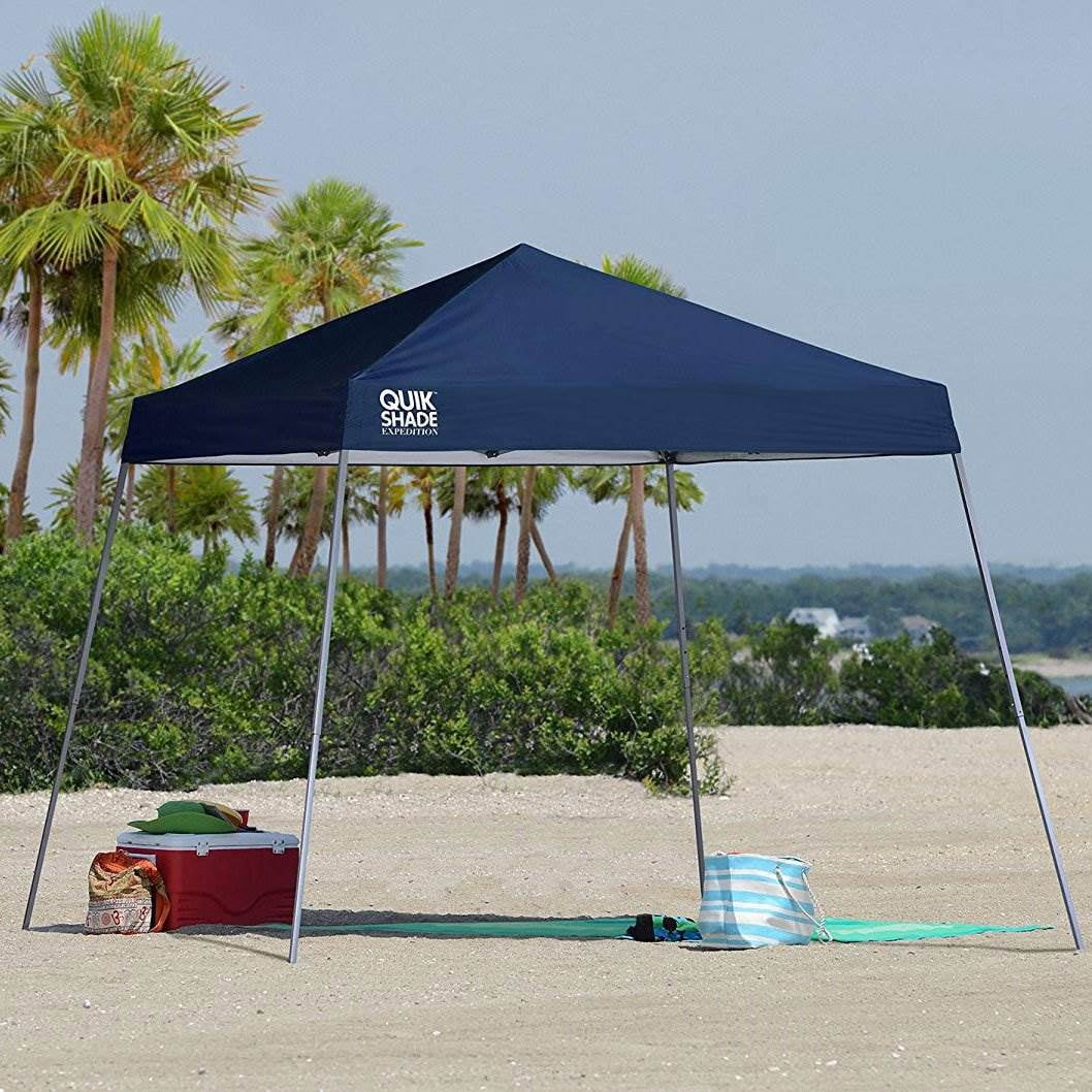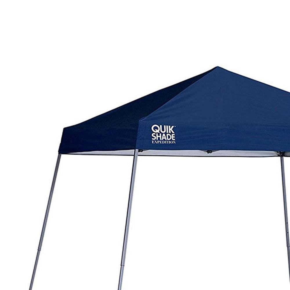 The 10 x 10 ft. slant leg Expedition canopy from Quik Shade provides up to 64 sq. ft. of shade. The perfect canopy for your next outdoor event, this unit offers three height positions and hardened thru-bolt assembly for a sturdy canopy unit. Patented overlapping eaves offer stability and the 150D polyester top with Aluminex gives you 99% UV protection. Set it up where you need shade at your next event, farmers market, sports event, and much more.