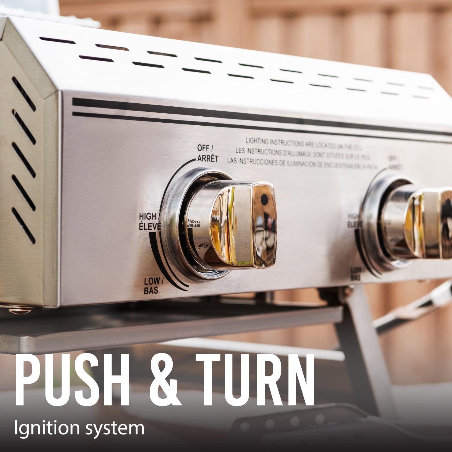 – A push and turn ignition system means you can light your burners with the simple push and turn of your control knob