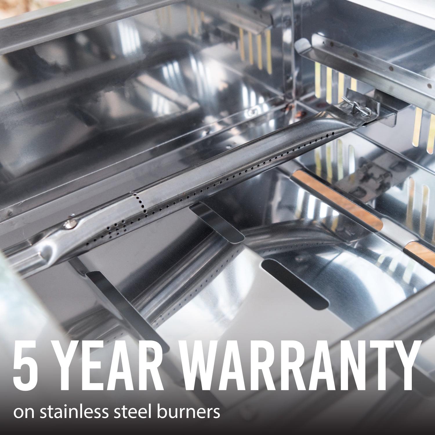 - 1-year limited grill warranty and 2-year limited burner warranty