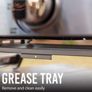 – Removable grease tray allows drippings to be funneled away from the burners and reduces your risk of flare-ups