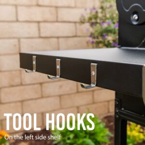 - Two fixed side shelves offer ample space for grill tools and food prep