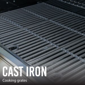 – Durable cast iron cooking grates provide the perfect grill marks and clean up easily when the grilling is done.