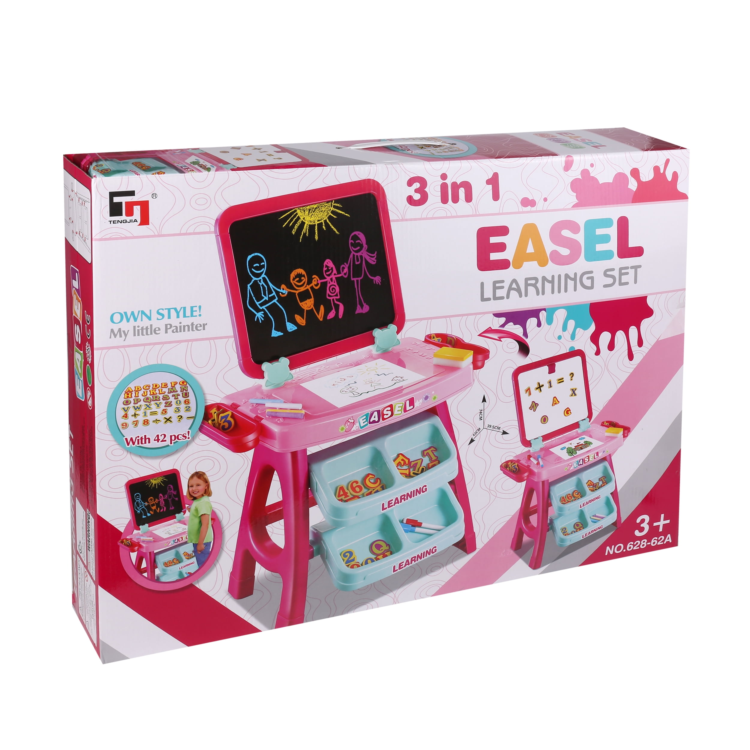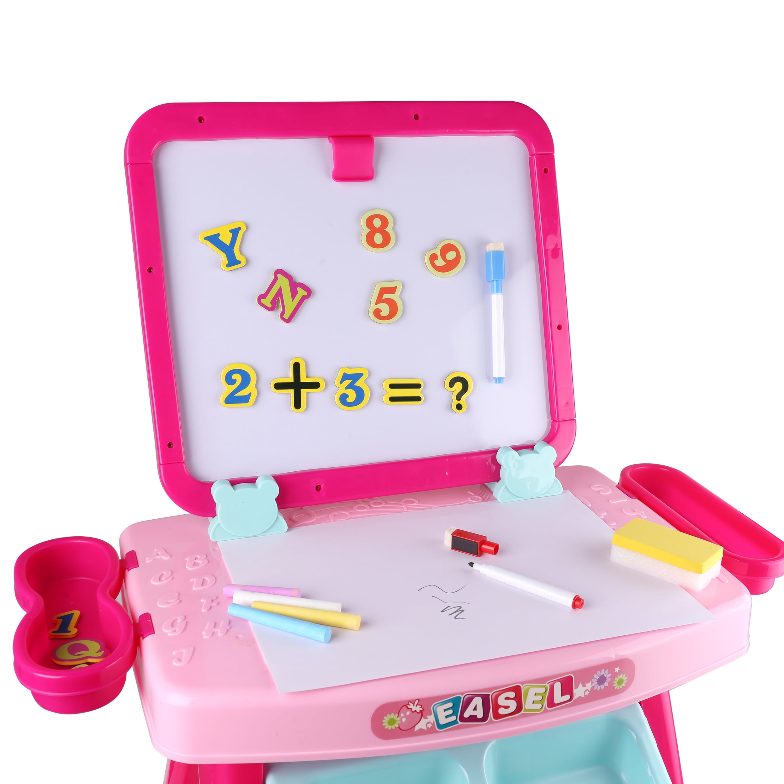 Drawing Board Toys for Boys & Girls Kids Art Easel with Magnetic Whiteboard & Chalkboard, Double-Sided Magnetic Board for Kids with Magnetic Letters, Numbers and Writing Tools & Accessories Specification: Material: High Quality ABS Color: Pink Dimensions: 17 *15.5*29 inch (standing) Double-Sided Magnetic Whiteboard & Chalkboard This Kid’s Art Easel includes two surfaces, Chalkboard on one side and magnetic dry erase board on the other. Flexible Use – Squatting, Sitting or Standing It is very suitable for the height of little ones aged 3-10. Standing 18 – 29 inches in height, suitable for kids to write or draw no matter sitting or standing. Magnetic Letters & Numbers Comes with magnetic letters and numbers, which can stick to the easel or any other magnetic surface, for kids to learn words and math. Easy To Wipe The magnetic chalkboard allows smooth writing, while the eraser with soft magnetic ensures that you can easily wipe the easel without leaving any marks. Big tray Storage Space Big tray to hold all the important accessories and keep magnet stickers and erasers handy. Your kids can easily access accessories through its middle storage area. Package Includes: 1 x Double Sided Drawing Easel Chalkboard & Magnetic Dry Erase Board For Kids with Storage 1 x Magnetic Letters & Numbers 1 x Eraser 1 x Box of Chalk 1 x Box of Crayons