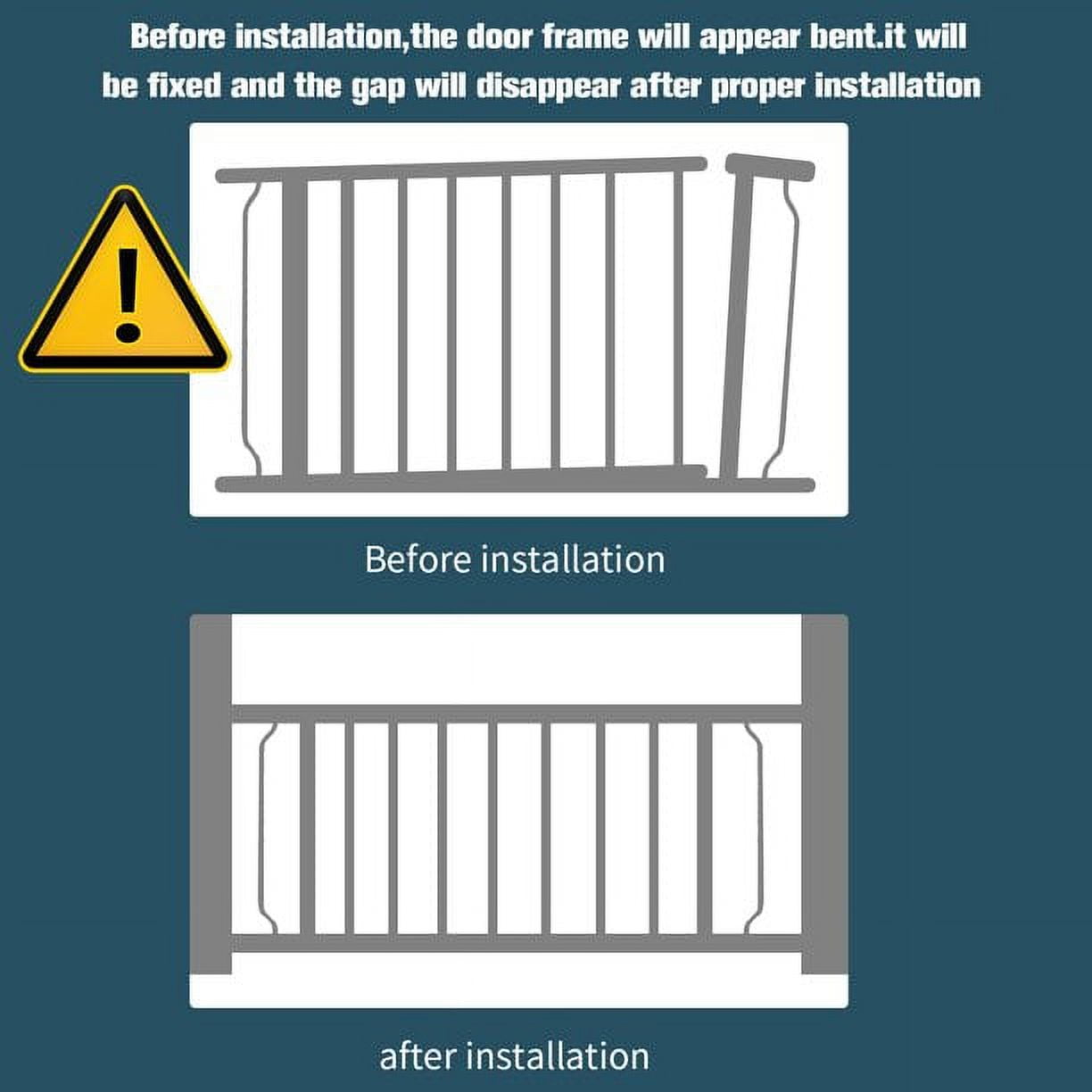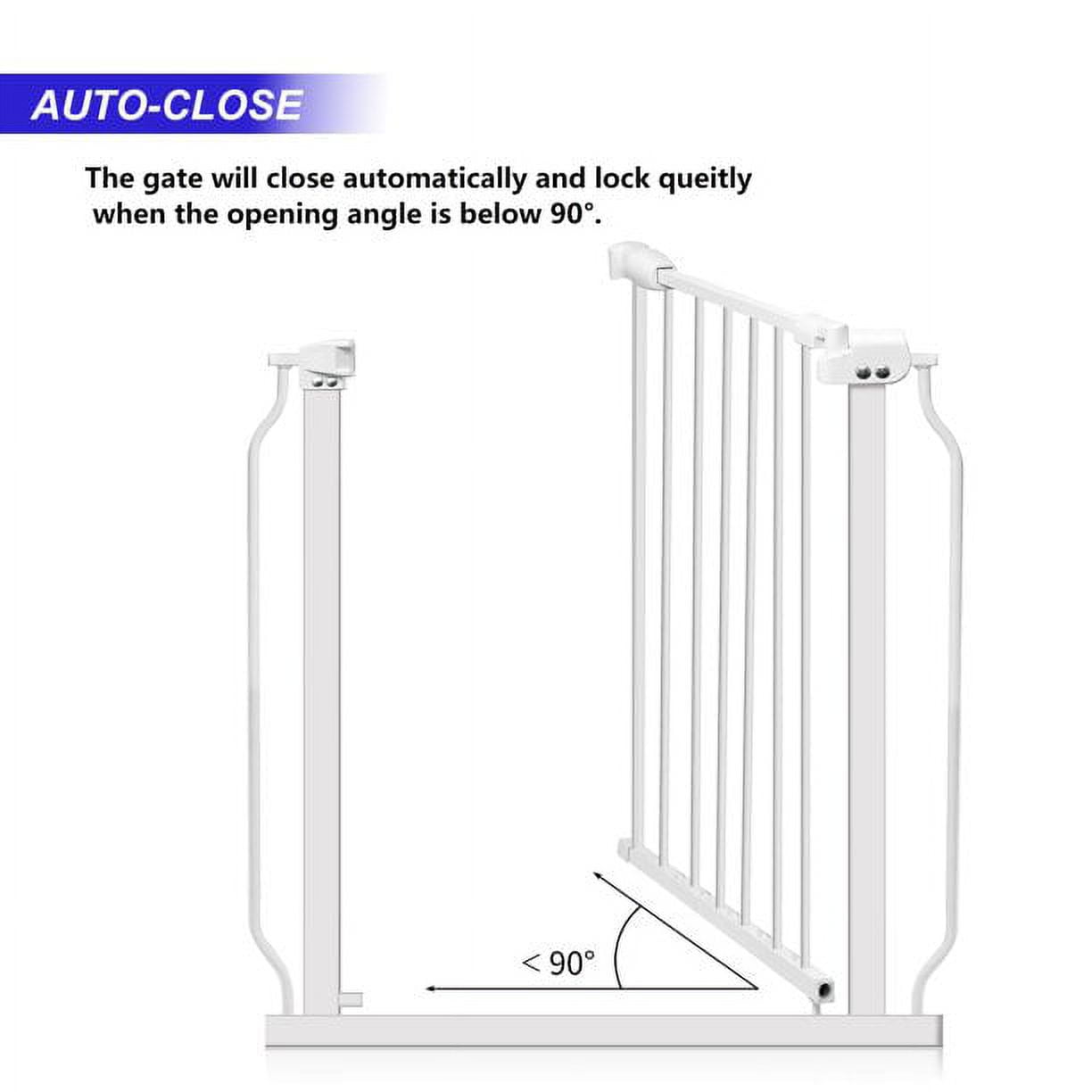Multiple Sizes – The height of the gate is 30″. You can choose the width of the gate according to your openings. There are multiple gate sizes. Choose for openings between 29.1″ – 33.8″, 29.1″ – 38.5″, 29.1″ – 43.3″, 43.3″ – 48″, 43.3″ – 52.7″, 43.3″ – 57.5″, or 57.5″ – 62.2″ Convenience – Gate door features an auto-close that gently closes the gate door behind you and a hold-open feature that keeps the door open. Easy to install- Pressure-mounted, tool-free installation requires no drilling or hardware and allows for setting up this extra-wide baby gate quickly and easily in doors or pass-through areas. Pressure mount design for fast and safety installation while protecting your walls.No screw or tools needed. Easy to read instruction. Easy to open- Hold handle and push towards side; Lift the handle up; Push to open. Durable and long-lasting – All steel gate is durable and convenient with a walk-through door. The gate is fully compliant with all USA Safety standards. Installation tips- Before installation there will be a gap between the latch and frame. This is not a defect and it is not bent. The gap will be eliminated upon install. Easy installation, Hold open, Auto close, Long lasting, Multiple sizes, Easy to clean