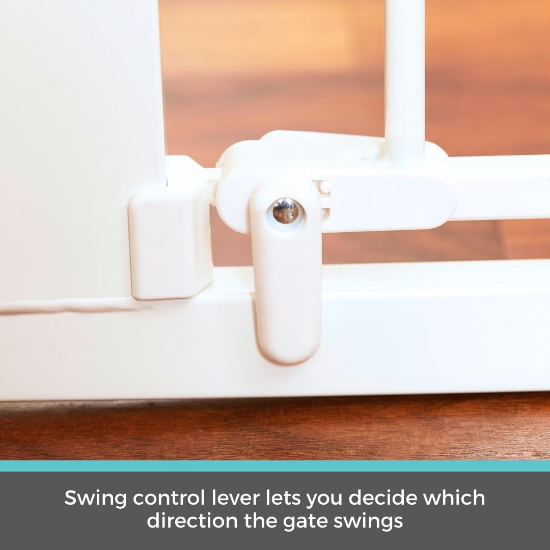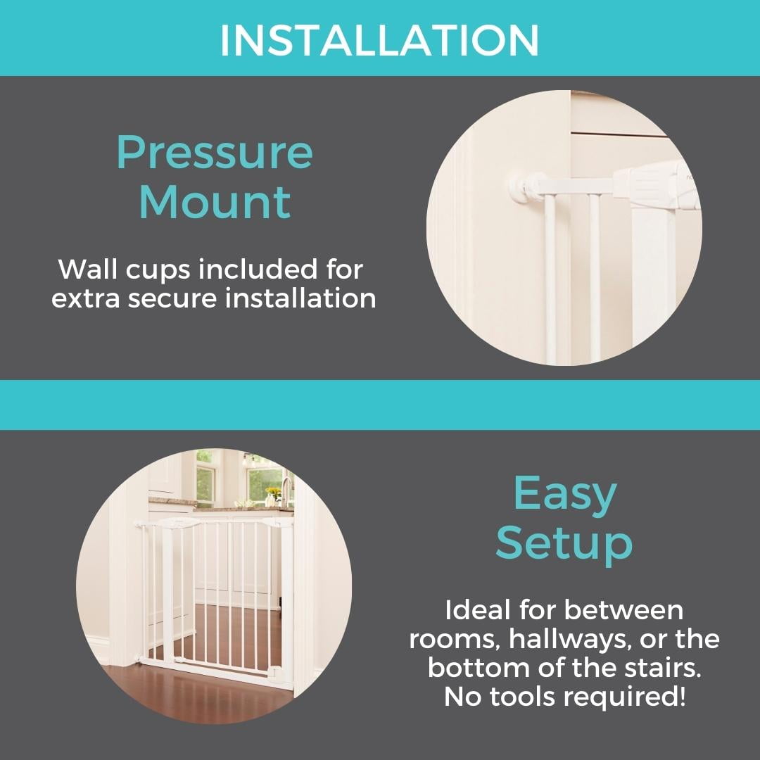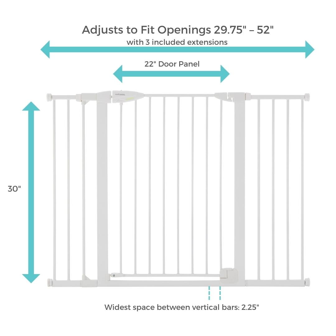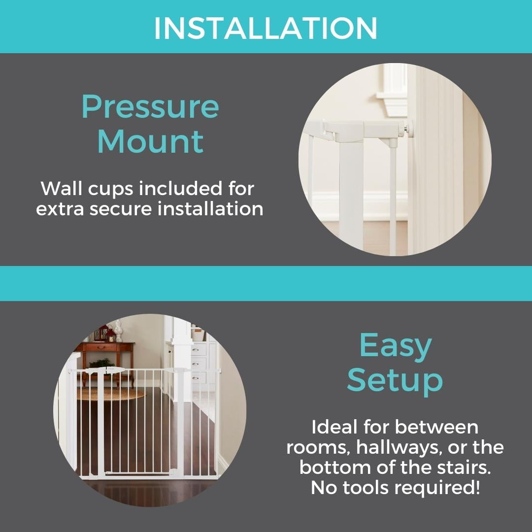 Location: Between Rooms/Hallways, Extra-Wide Openings/Barrier Width: Adjusts to fit 29.75″ – 52″ wide Mounting: Pressure Mount Height: 30″ Material: Metal Easy to use – extend tension knobs until gate fits tightly Light-sensing illuminating easy-grip handle with one-hand operation