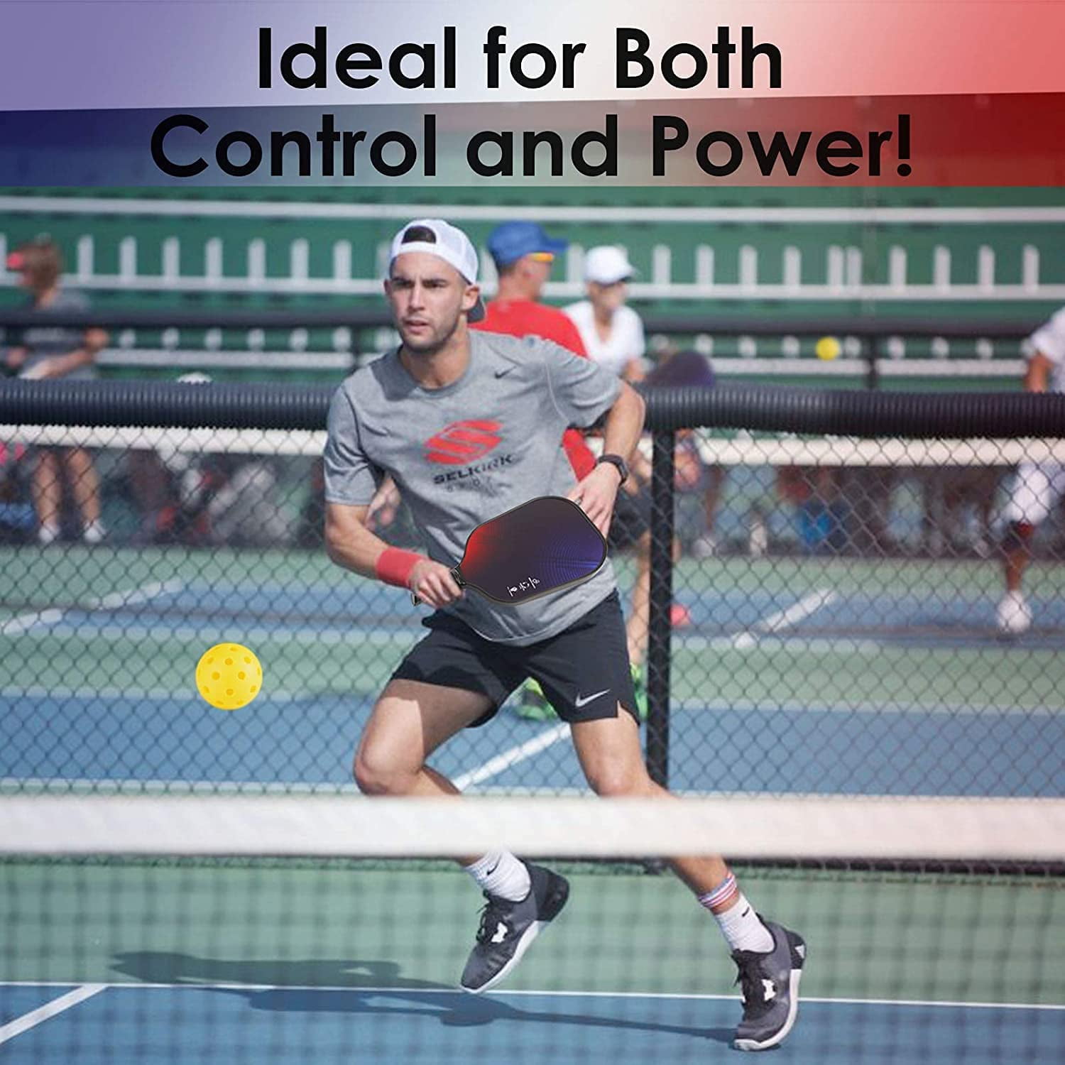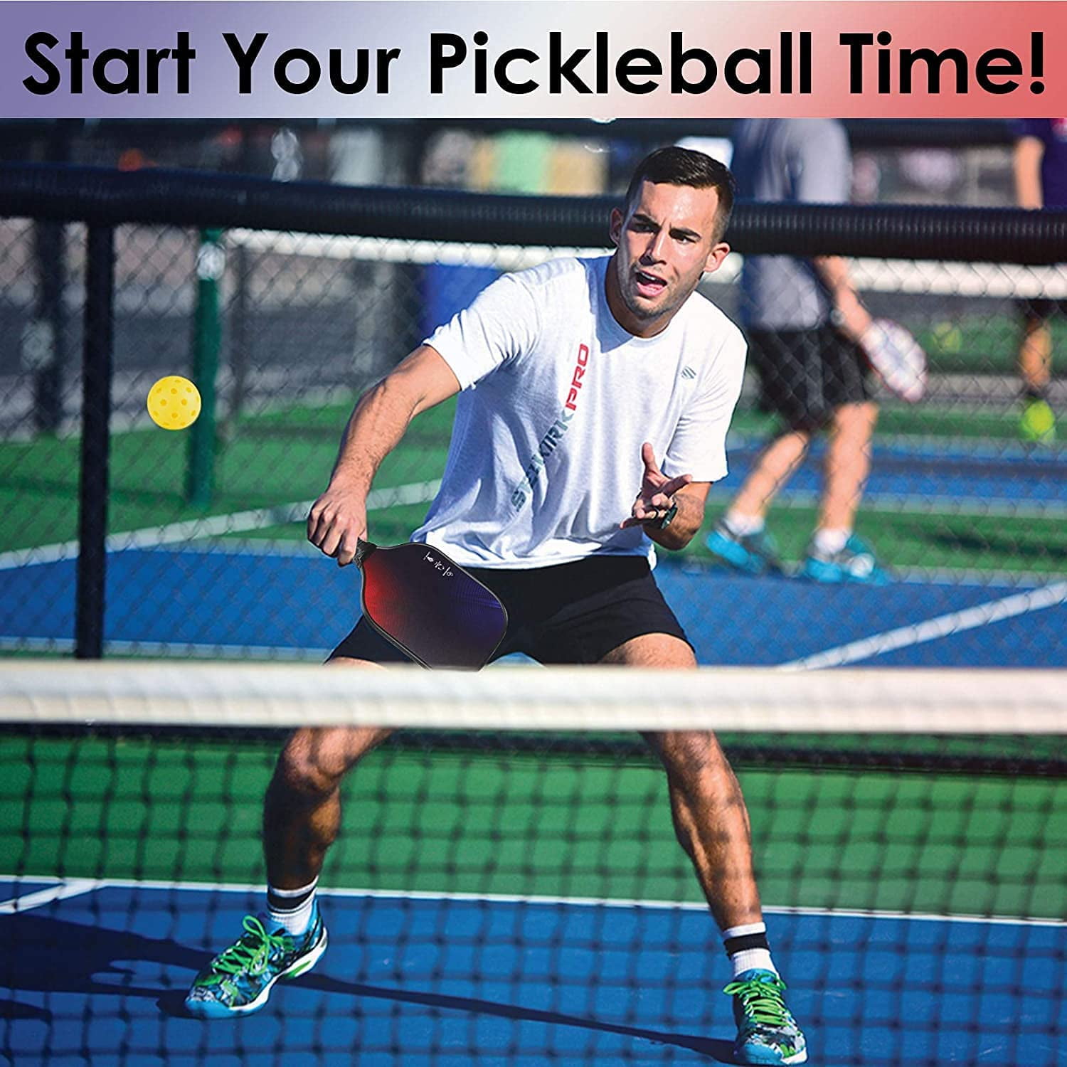 【Excellent Carbon Fiber Surface】Pickleballs paddle set adopts carbon fiber surface design, which has structural stability and effectively improves hitting stability and torsion resistance. Durability and resilience even during continuous training and intense competition. 【Premium Polypropylene Honeycomb Core】Polypropylene honeycomb core has powerful performance. The honeycomb core structure is particularly stable, can sufficiently receive the ball and cushion the impact, enhancing the power and control of the pickleball. 【Comfortable Ergonomic Handle】Premium ergonomic handle makes pickleball easy to hold, good for wicking sweat and prolonged play. Unique perforated design and soft non-slip material make every swing very smooth. Whether you are children, adults, or elderly, can hold it comfortably. 【Powerful edge protection】With only 7.8oz per paddle, it effectively protects wrists, arms, and shoulders and is painless even after prolonged use will not feel pain. A black edge guard with high durability protects your paddles from occasional nicks and makes the whole racket full of technology. 【Fashionable Pickleballs Set】Pickleball Paddles contain 2 fine rackets, 4 high-quality Pickleballs, and a tote bag. Nice mesh pocket for sports gloves and rule book. The shoulder strap and hand strap are designed so you can carry them ?in a variety of positions and participate in community pickleball games in style. 【 Pickleballs Paddle】Net: 1.76 lb