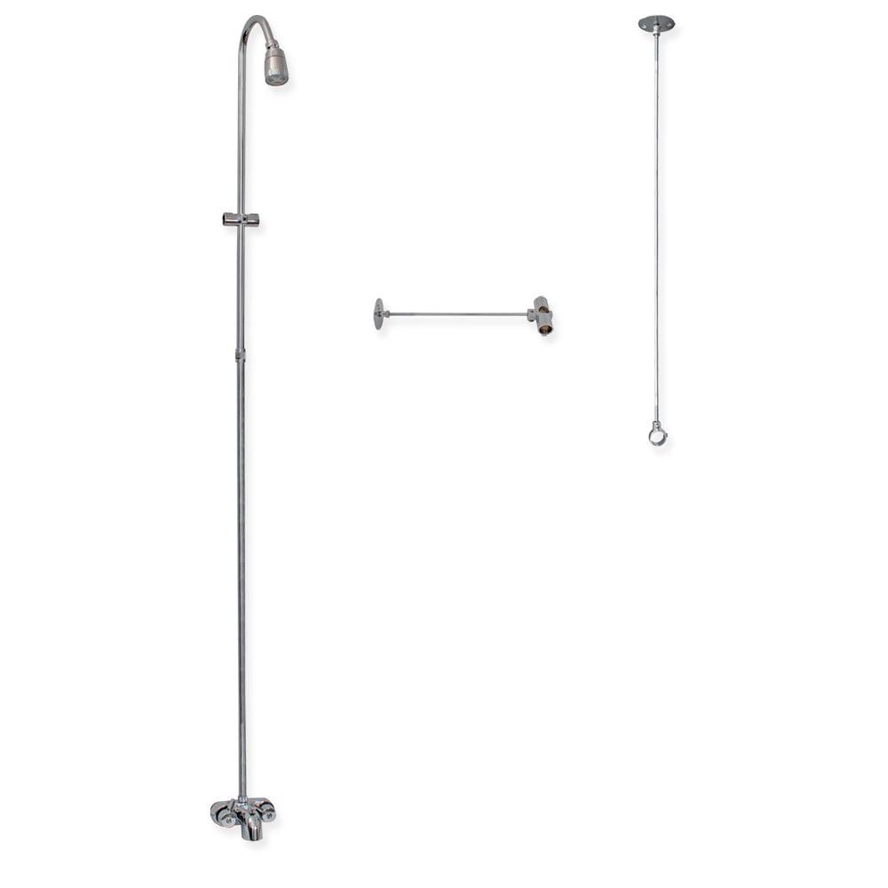 – COMPLETE- Includes (1) wall & ceiling support bracket, (1) ABS shower head with 1/2 in. FIP connection, (1) brass riser 3/8 in. x 61-1/4 in., (1) diverter bathcock, (1) ceiling rod 36 in., (1) aluminum shower frame 27 in. x 42 in.