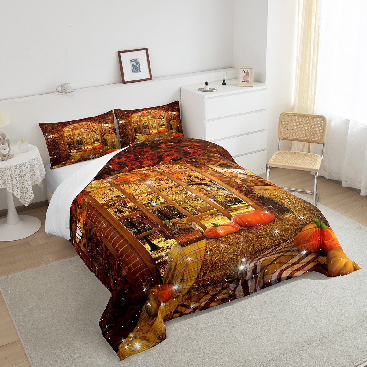 Fall Bedroom Decor Comforter Set Queen Women Autumn Harvest Theme Bedding Happy Fall Y’All Bedding Comforter Sets Rustic Pumpkin Print Duvet Insert Fall Decor Thanksgiving Day Gifts Quilt