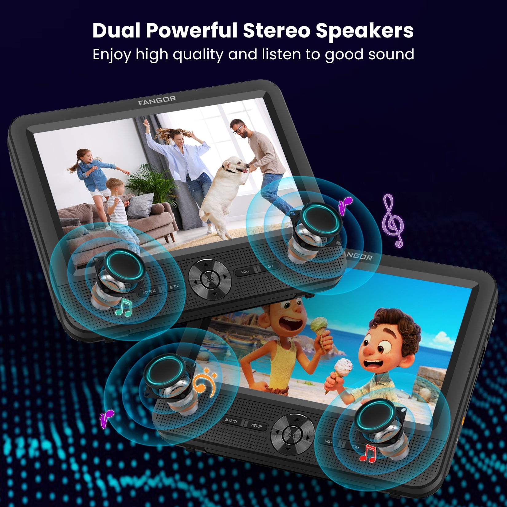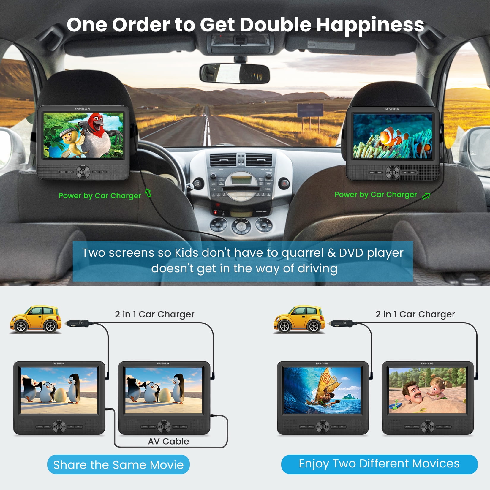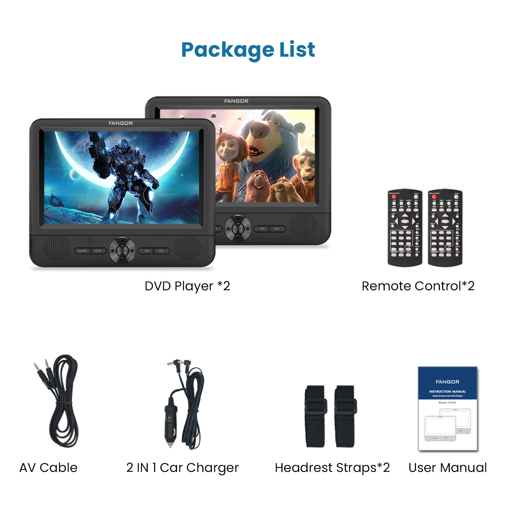 🚗【2 x Car DVD Player & 1080P】FANGOR New generation 7.5″ dual screen car dvd players adopt newly chip technology, provides crystal clear image and supports HD 1080P video, has stable performance even during bumpy rides.The dual screen DVD player can play the same or two different movies, Just connect via AV cable to play the same movie.(Equipped with 2 IN 1 high quality car charger, only use for car, (without built-in battery) 🚗【Upgraded front dual speakers & Clamshell Design】FANGOR headrest car dvd player is specially designed with upgraded dual front stereo speakers provide clearer stereo sound, also can avoid sound disturb to the driver and front passengers. Volume can be adjusted separately by player or remote. Each player has a headphone jack, so your child can use wired headphones to watch their favorite videos more intently. And the clamshell Design makes it simple for children to change disc. 🚗【Easy installation&Last Memory】FANGOR Portable headrest dvd Player come with two customized headrest straps, easily to install to car headrest without the need for any tools, also can be conveniently moved to other back seat or vehicles.Beside,the last memory function keeps your viewing progress and always starts from where you leave off. Enjoy all your collections from now on! 🚗【Wide Compatibility】FANGOR Portable car dvd player has wide compatibility, support all regions discs: CD, DVD, CD-R/RW, DVD-R/+R, DVD+RW/-RW, VCD to SVCD (but not support blue-ray disc).Support USB & SD (support max to 32GB FAT32 and 720*576 pixels), you could play multiple videos/audios/images. Support Video Formats: VOB, AVI, MPEG 1, MPEG 2, XVID, MPG, 3GP, DAT. Support Audio Formats: MP3/WMA. Support Image Formats: JPG/JPEG. 🚗【Travel companion&100% Customer Service】FANGOR dual screen dvd player for kids create a happy and entertained space for backseat, makes kids enjoy themselves, eliminates children’s anxiety and restlessness because of boring, so you can drive in peace comfortably and safely. Besides, if you have any issue about it, don’t worry, just feel free to contact us, we will try our best to reply you within 24 hours and provide the best solution to ensure your profit.