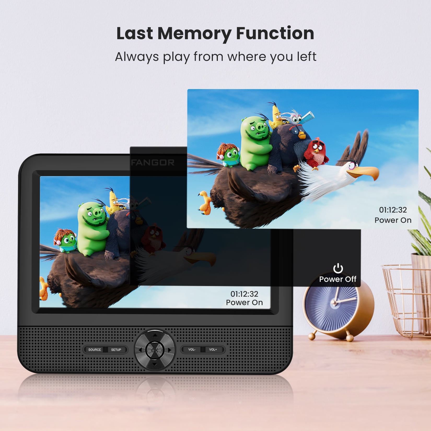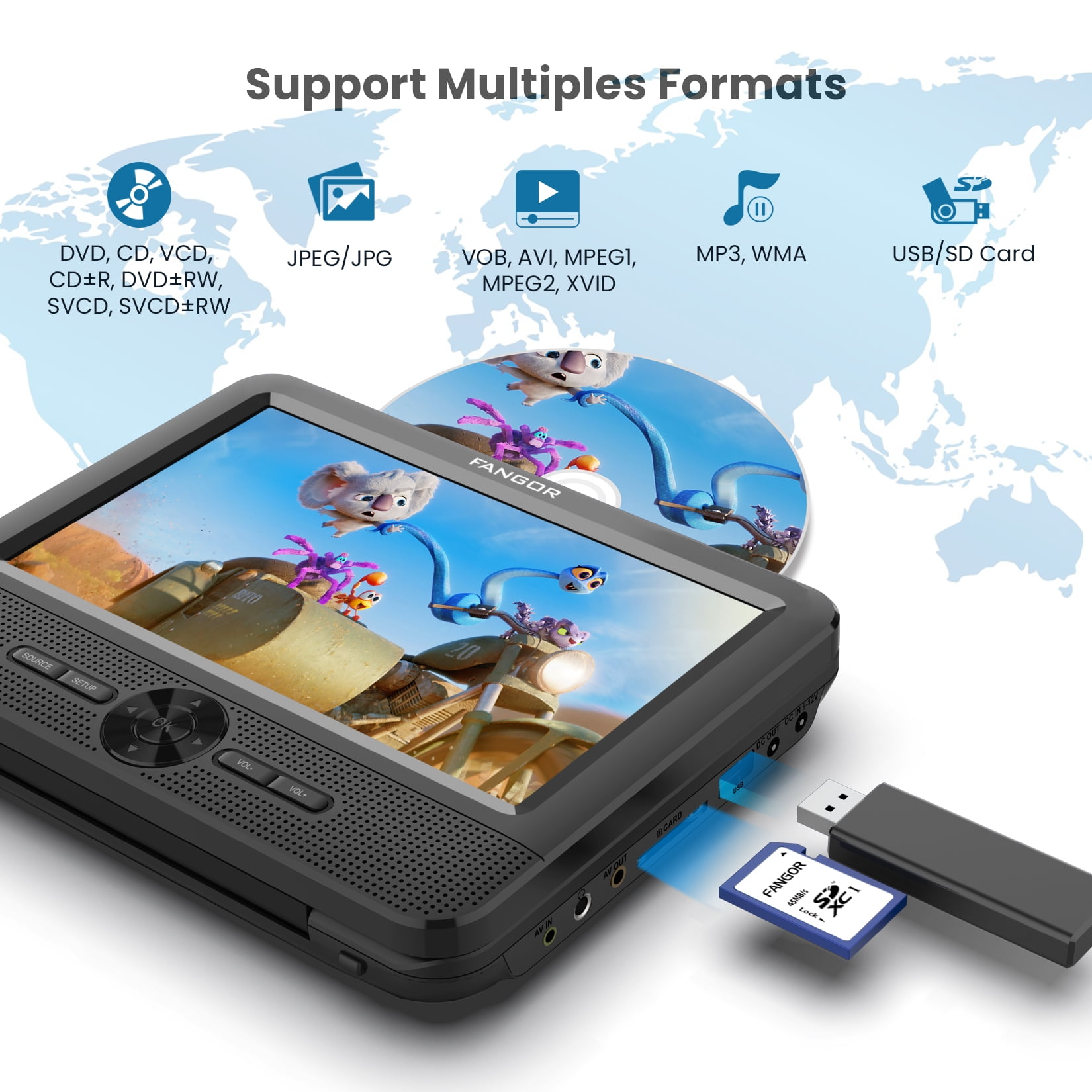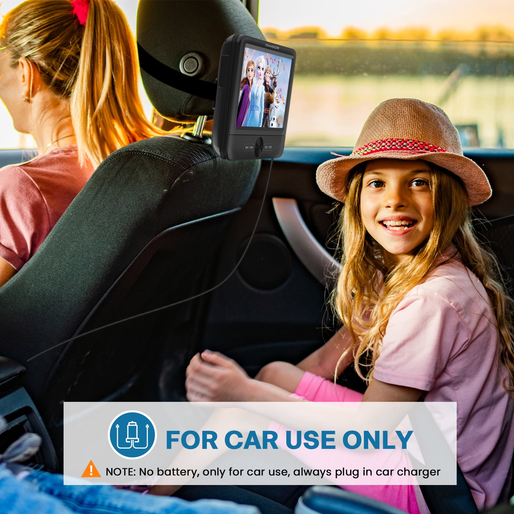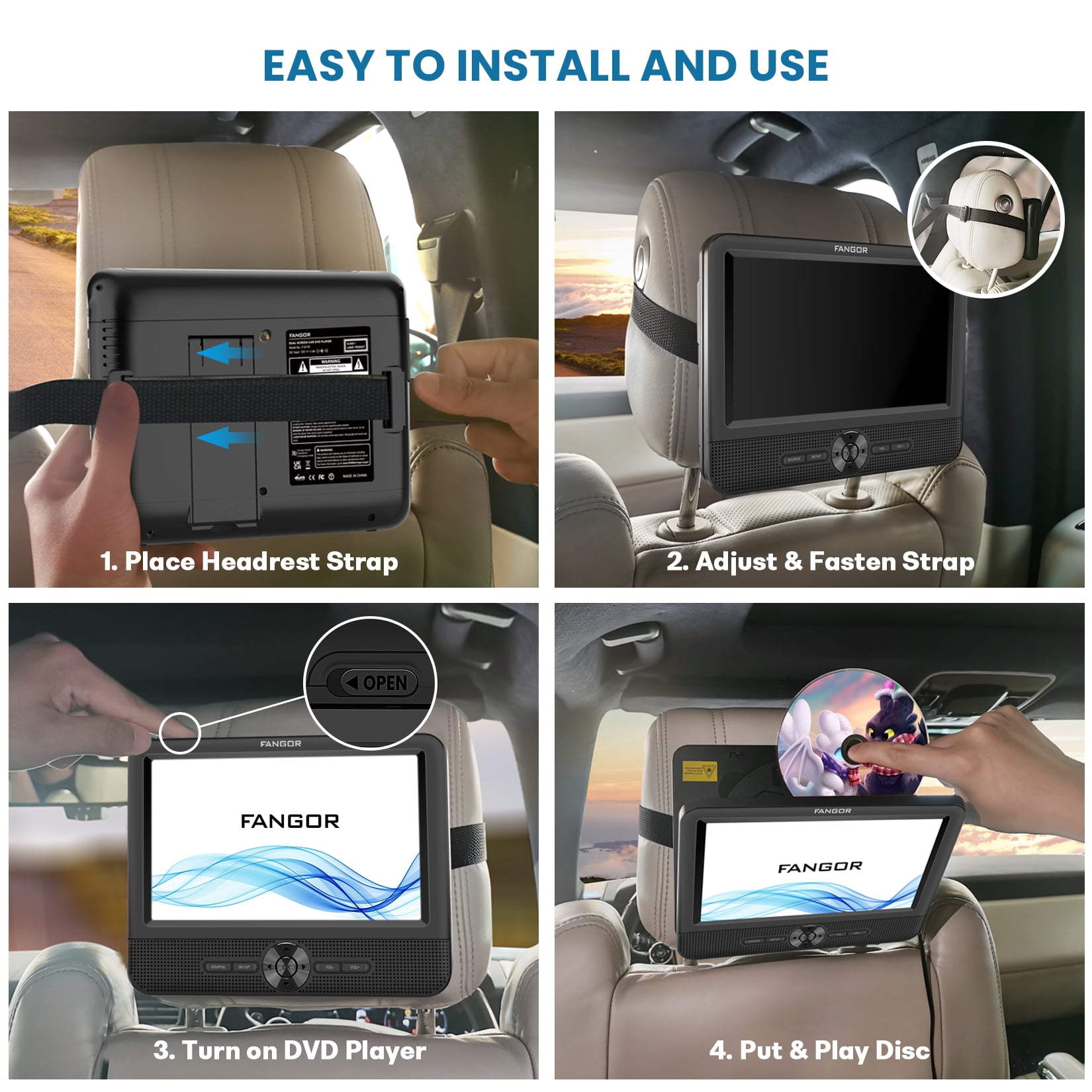 During the holiday trip, Do you want to have a perfect and pleasant long road trip? Are you annoyed by your child’s noise, crying, boring, and anxiety in the car? If yes, Choose FANGOR 7.5″ Portable Headrest DVD Player, it can perfectly help you spend a pleasant long road trip! Choose FANGOR 7.5″ Dual Screen DVD player for car, keeping your kids happy and quiet in the back seat will never be a worry on your trip! ?Why choose the FANGOR Headrest DVD Player for Car? 1. Dual Screen DVD Player??Can play the same or two different movies on two screen 2. Upgraded front dual speakers??provide clearer stereo sound, also can avoid sound disturb to the driver and front passengers. 3. All Regions Support??Support all regions discs from CD, DVD, CD-R/RW, DVD-R/+R, DVD+RW/-RW, VCD to SVCD (but not support Blu-ray disc) 4. Last Memory Function??Always start where you left off 5. Easy installation: Just use your hands to easily install on the back seat of your car, and can be easily moved to other rear tables or vehicles at any time, Your child can also install the DVD player by himself.