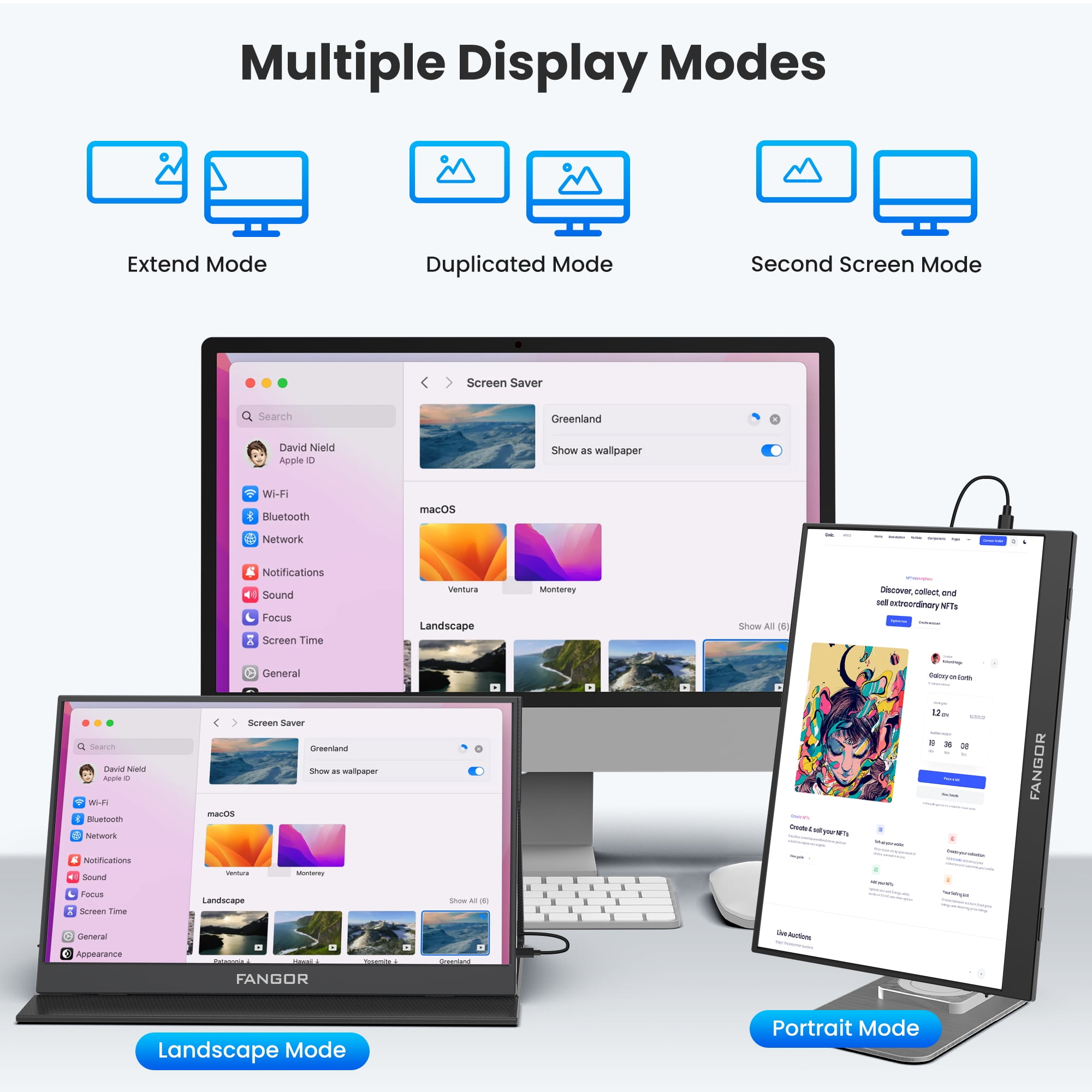🖼️Full HD 1080P IPS Screen The Fangor 15.6 inch portable monitor is a high-performance, usb c monitor device equipped with a Full HD 1080P IPS panel. It offers a resolution of 1920*1080, supports a wide 178°viewing angle, and boasts a 60Hz refresh rate with FreeSync functionality, ensuring smooth, stable visual experiences(16.7M, 100%sRGB). 🔌Broad Compatibility Equipped with versatile USB Type-C and Mini-HDMI ports, this FHD display seamlessly connects with laptops, smartphones, Macs, PCs, Switch, Xbox, and more. It’s plug-and-play ready, eliminating the hassle of drivers and minimizing cable clutter, making it an ideal companion for any device. ▶️Flexible Display Modes Adaptable to your needs, the Fangor IPS monitor supports multiple modes including Duplicate Mode, Extended Mode, and Second Screen Mode. Whether for presentations, multitasking, or gaming, switch effortlessly between modes to maximize productivity and enjoyment. 💻Design with Built-In Speakers Featuring a new button design for intuitive menu navigation, the portable laptop monitor also includes built-in dual speakers for clear audio output. The 3.5mm audio jack allows for private listening with headphones or enhanced sound with external speakers, ensuring a superior audio-visual experience. 💼Ultra-Portable and Lightweight Weighing just 1.7 pounds and only 0.3 inches thick, the travel monitor is designed for mobility. The durable PU leather cover doubles as a stand with multiple viewing angles, providing protection and convenience wherever you go. Perfect for business trips, commuting, or leisure travel. 🛡️Comprehensive After-Sales Support Enjoy peace of mind with a 30-day unconditional replacement policy, lifetime technical support, and 24/7 customer service. The Fangor 15.6-inch portable screen guarantees reliability and satisfaction, making it the ultimate portable display solution for work and play.