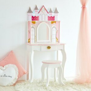 Give your little one a place to get ready while adding elegant decor with the Fantasy Fields Dreamland Castle Vanity Set with Chair and Accessories. This elegant vanity set features a pink and white castle design with towers, columns, and a rooftop area for a fun and functional addition to your child’s bedroom or play area. This kids vanity set features an elegant acrylic glass mirror and an included stool to make getting ready easy and fun. The included built-in drawer provides plenty of space for makeup, brushes, and toys for a stylish solution to your child’s storage needs. This vanity set also includes 4 furniture accessories that allow your child to decorate their castle. Constructed from durable wood, this table set is built to provide long-lasting use. The Fantasy Fields Dreamland Castle Vanity Set with Chair and Accessories measures 23.5″ x 12.5″ x 46.5″ to fit in almost any bedroom or play area, supports up to 100 lbs., and is recommended for children ages 3 years and up.
