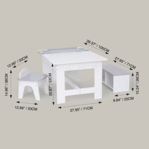 – DIMENSIONS: The table measures 39.5″ long, 28″ deep, and 21″ tall. The chair measures 13″ long, 13″ deep, and 15″ tall. The storage bench measures 28″ long, 10″ deep, and 10.25″ tall. Ideal paper roll size less than 13″, not included.